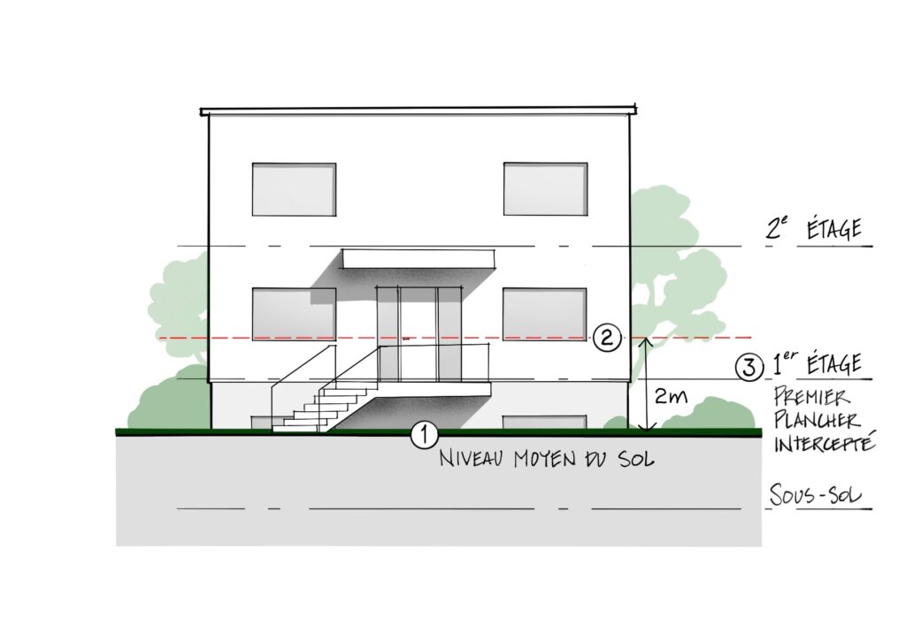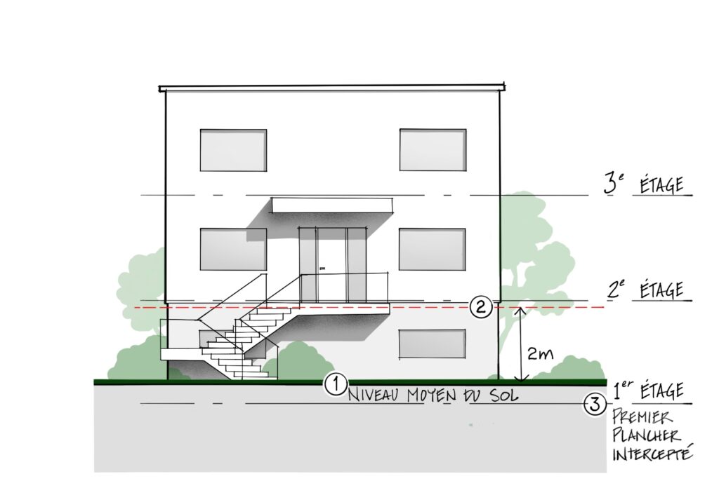 « premier étage » : étage le plus élevé dont le plancher se trouve à au plus 2 m au-dessus du niveau moyen du sol.