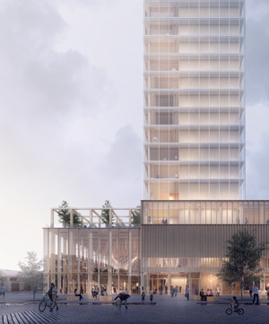 « C’était un défi pour nous de voir jusqu’où on pouvait aller avec une construction en bois », explique l’architecte Oskar Norelius de White Arkitekter, qui a piloté le projet avec son collègue Robert Schmitz. Pour assurer la stabilité de la structure, deux noyaux formés de panneaux de bois lamellé-croisé ont été prévus aux extrémités de la tour. « On voulait que le projet devienne une vitrine pour l’industrie locale », souligne l’architecte, ajoutant que le bois utilisé provient de la région. Les poutres apparentes, en bois lamellé-croisé, seront ainsi mises en valeur par une façade en verre.