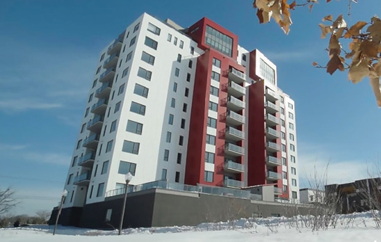 En plein cœur de l’écoquartier de la Pointe-aux-Lièvres, près du secteur Saint-Roch à Québec, s’élève une tour de 13 étages dont la structure est faite de bois massif : poutres et colonnes (lamellé-collé), murs porteurs (lamellé-croisé) et même puits d’ascenseurs et escaliers (lamellé-croisé). En tout, 92 appartements se répartissent sur 12 étages qui sont ancrés sur un podium en béton armé.
