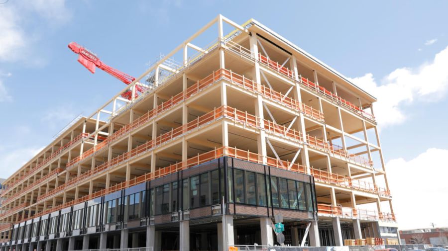 Le choix du bois dans la structure de cet immeuble de bureaux a permis une réduction de 38 % du carbone intrinsèque.