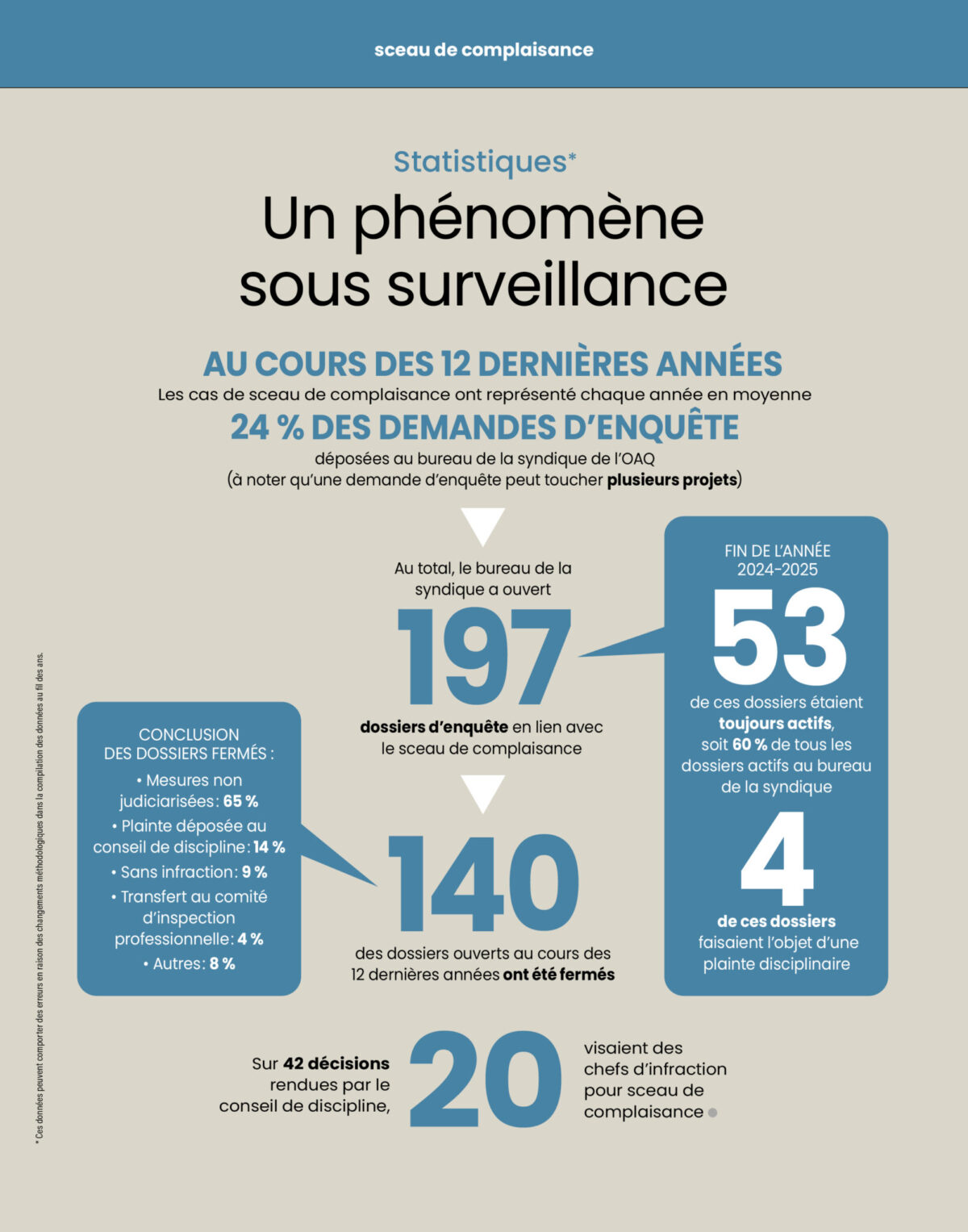 Au cours des 12 dernières années, les cas de sceau de complaisance ont représenté chaque année en moyenne 24 % des demandes d'enquête déposées au bureau de la syndique de l'OAQ.