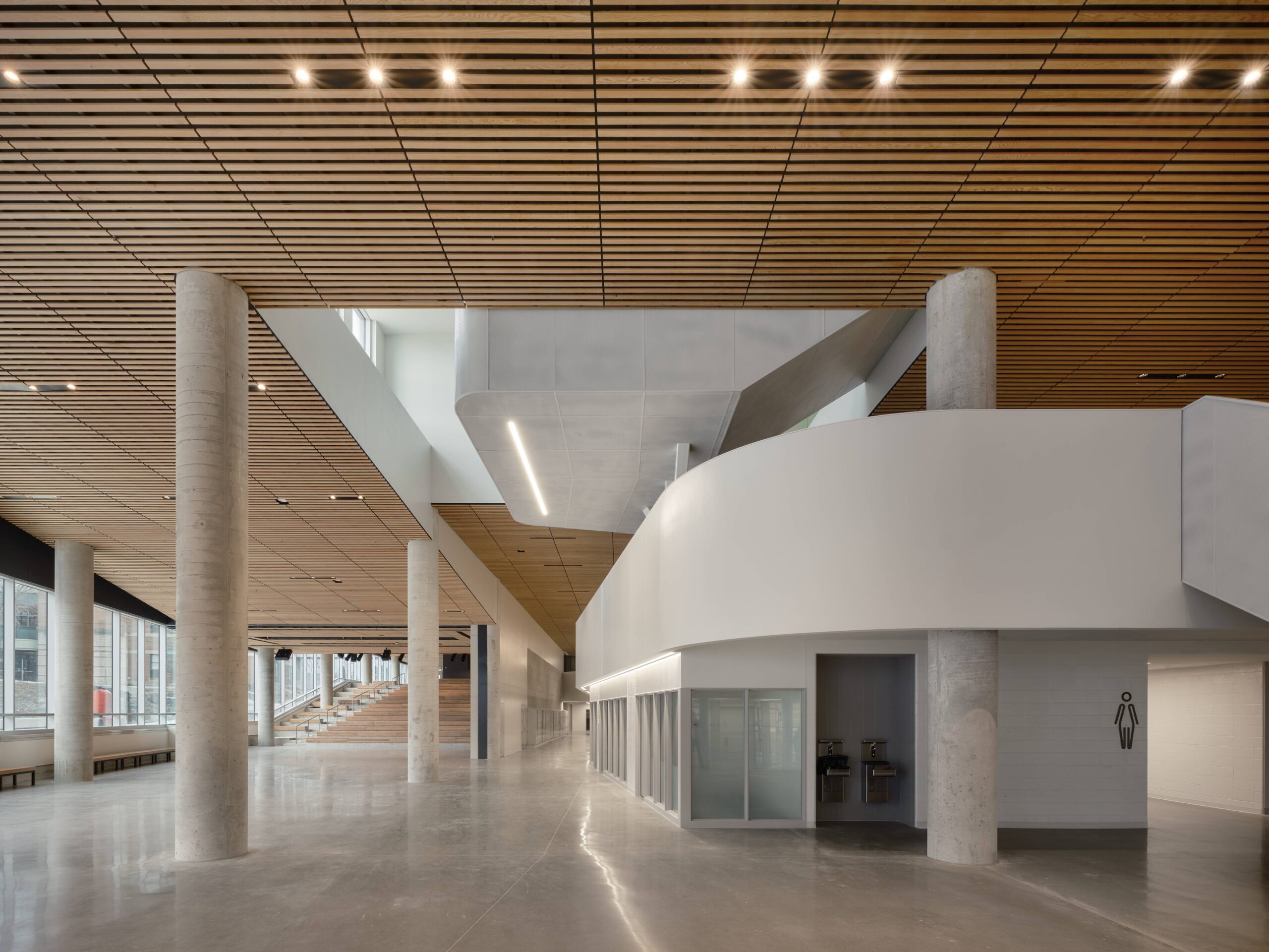 À l’intérieur, l’école s’organise autour d’un grand cœur qui réunit cafétéria, gradins et auditorium. Chaleureux et baigné de lumière naturelle, cet espace polyvalent favorise les rencontres et structure naturellement les déplacements. Depuis ce lieu central, les élèves accèdent intuitivement aux plateaux sportifs et aux zones d’apprentissage réparties sur plusieurs niveaux, découvrant une variété d’ambiances, tantôt recueillies, tantôt ouvertes et propices à l’apprentissage et à la curiosité. Les circulations s’y déploient également vers le bâtiment existant.