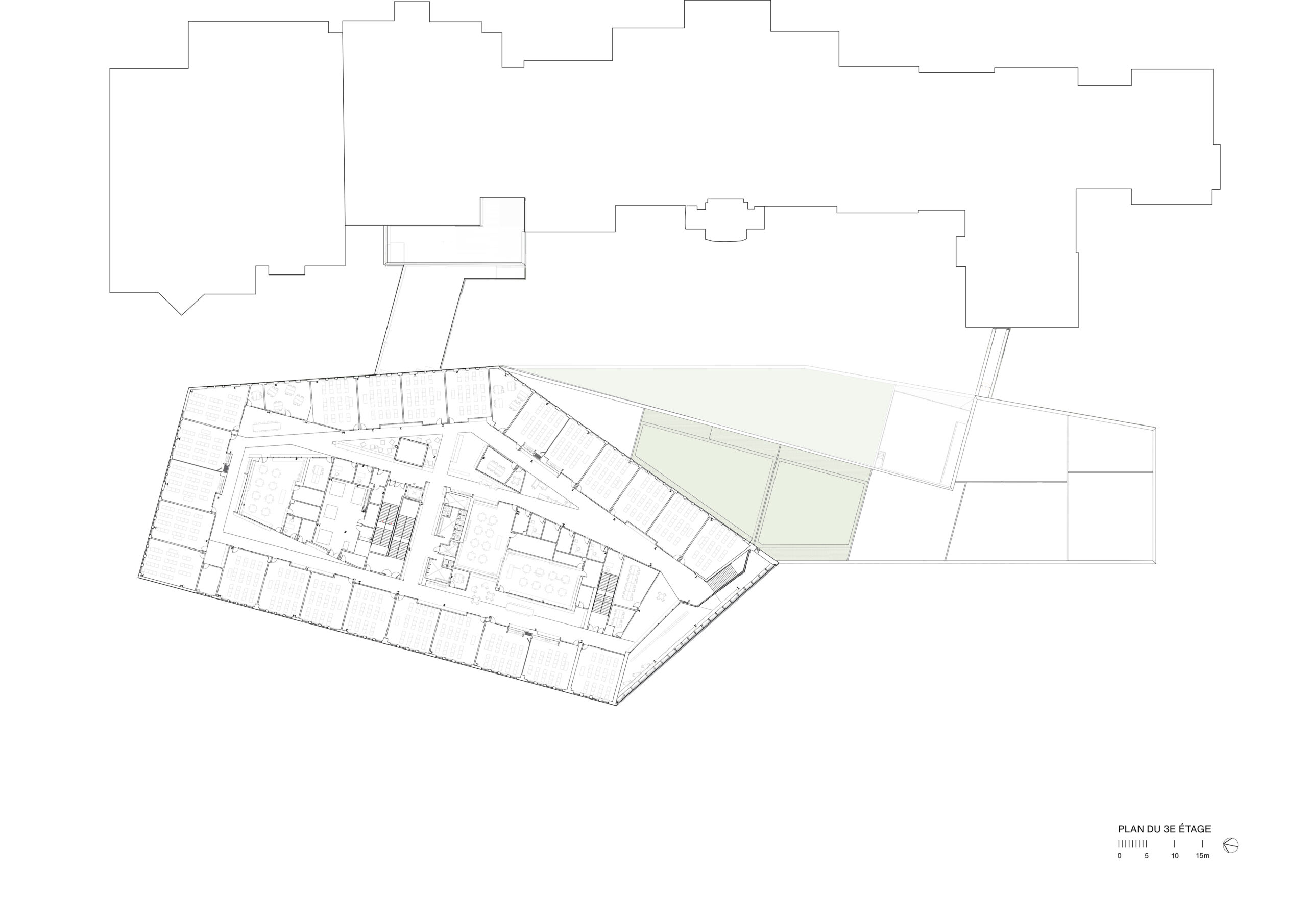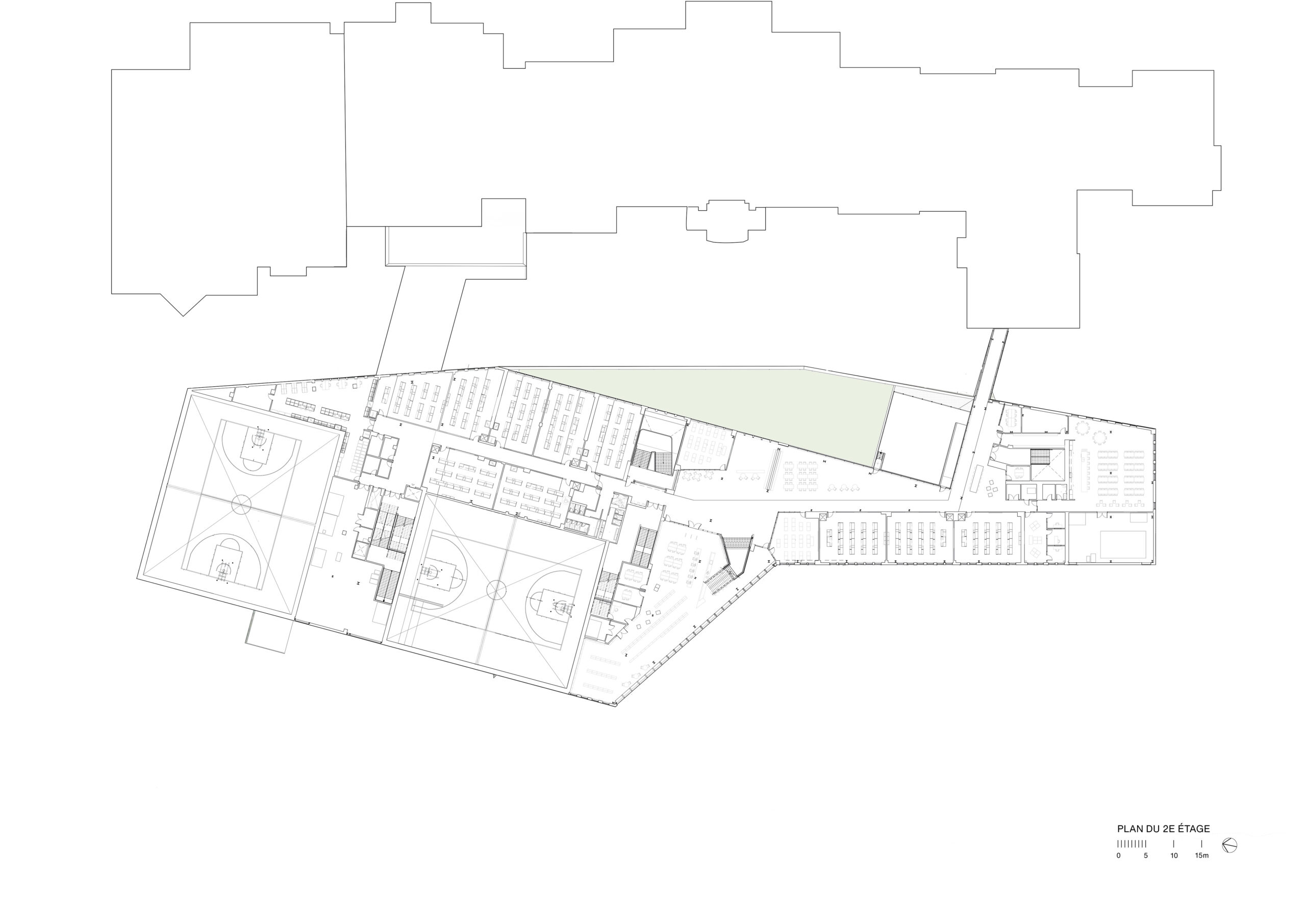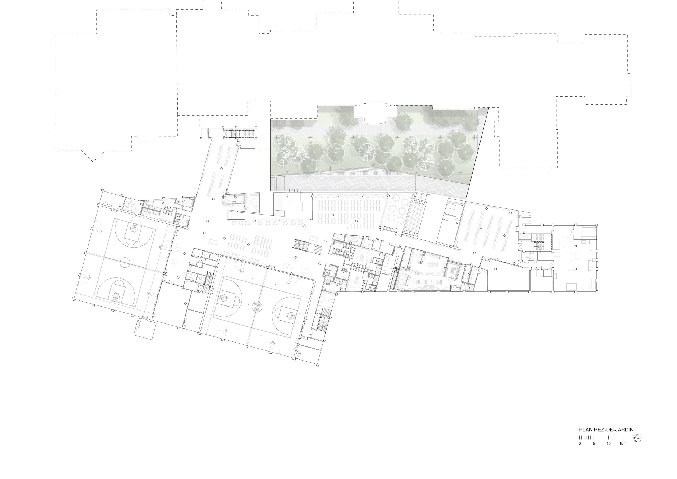 Le projet s’articule autour d’un nouveau bâtiment implanté en dialogue avec l’école existante. Une vaste esplanade d’accueil, sur la rue, ancre l’établissement dans son quartier, tandis qu’une façade largement vitrée affirme sa présence urbaine et invite la lumière à pénétrer abondamment dans les espaces intérieurs. Entre l’ancien et le nouveau, un jardin linéaire devient le pivot écologique et social du campus. Cet espace de transition, de rassemblement et de découverte permet à la nature de participer activement à la pédagogie, mais également de préserver une perméabilité au site offrant aux usagers un accès à l’ensemble des plateaux sportifs existants extérieurs.