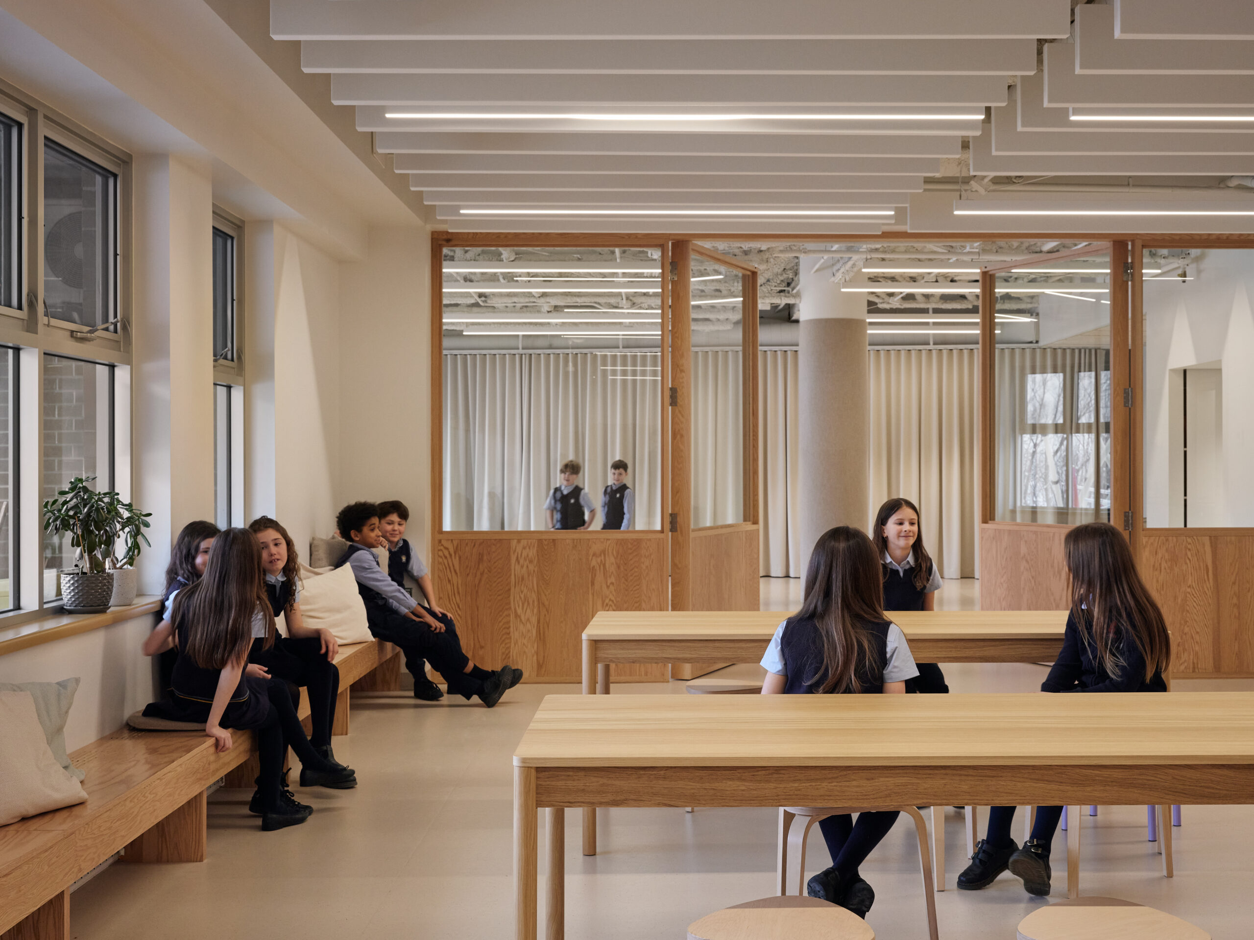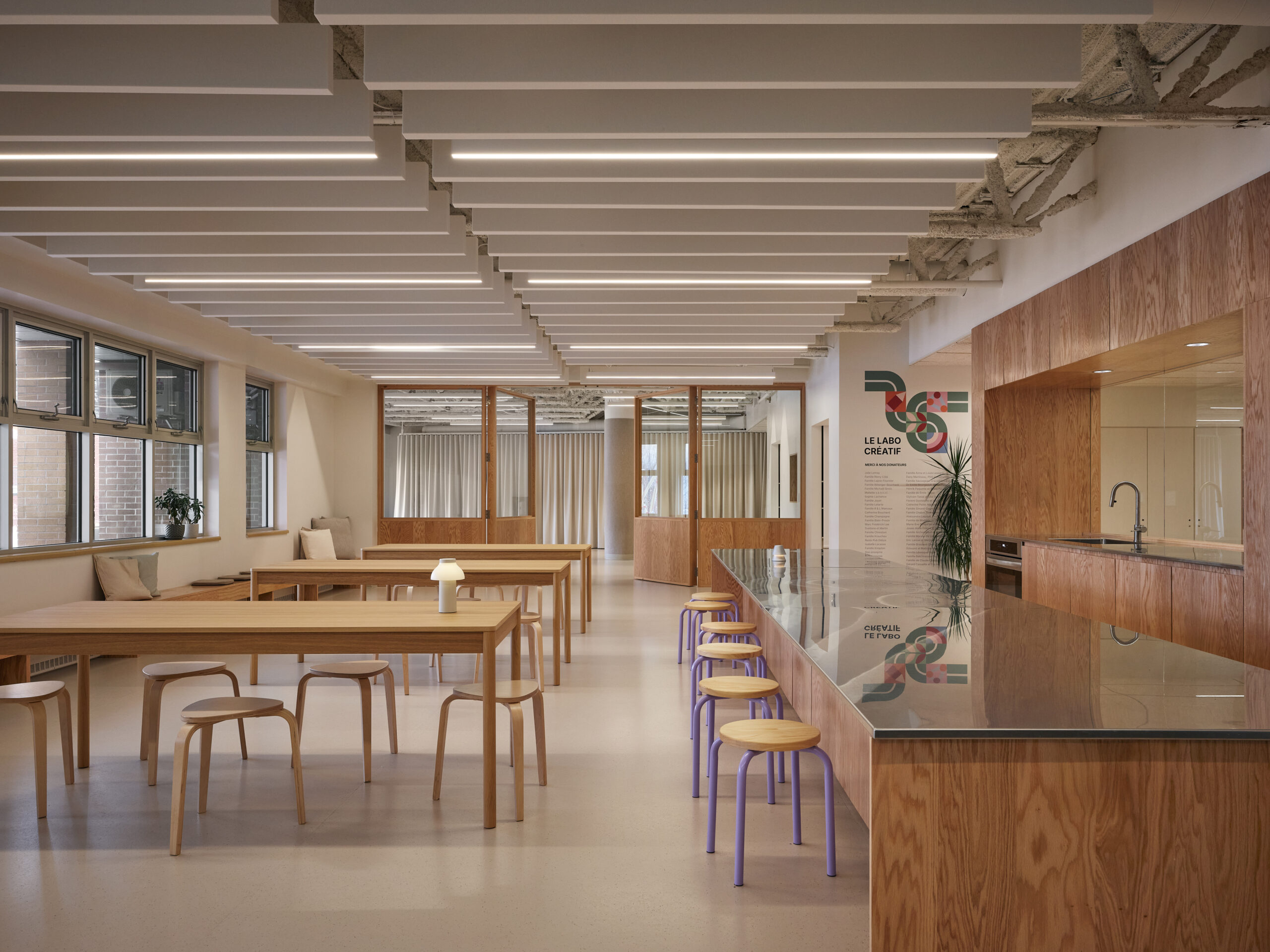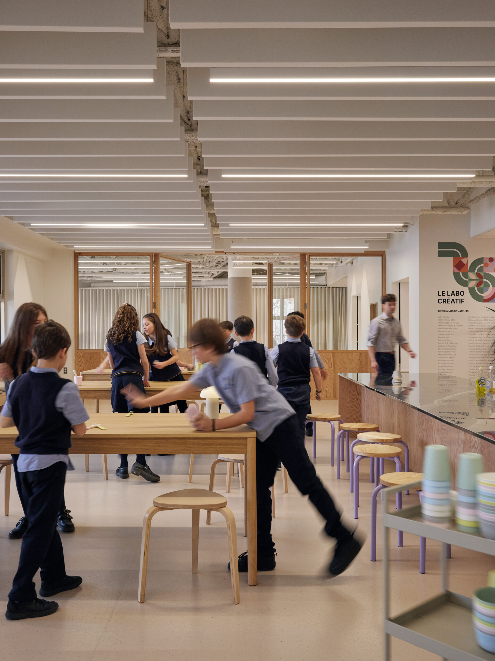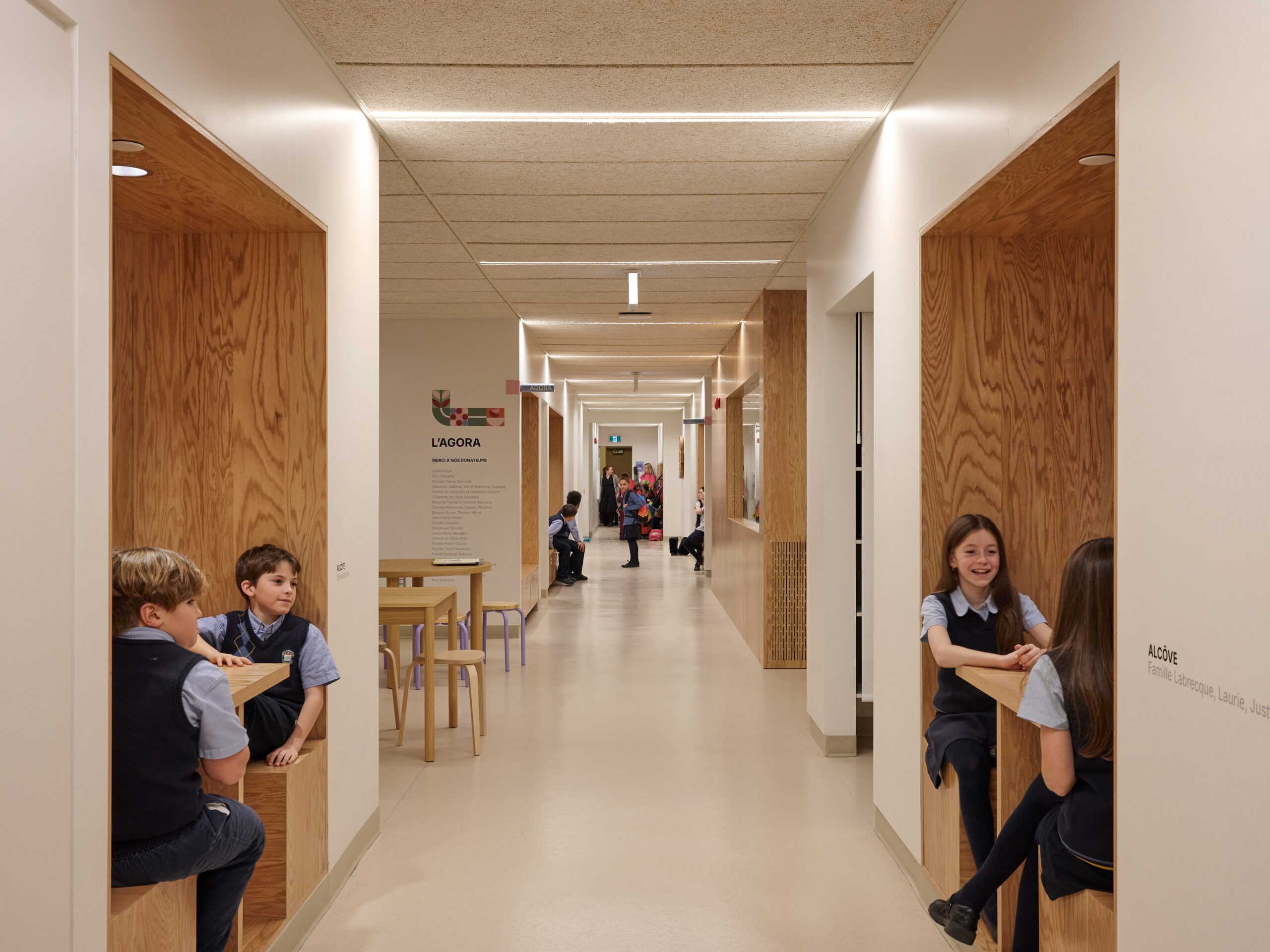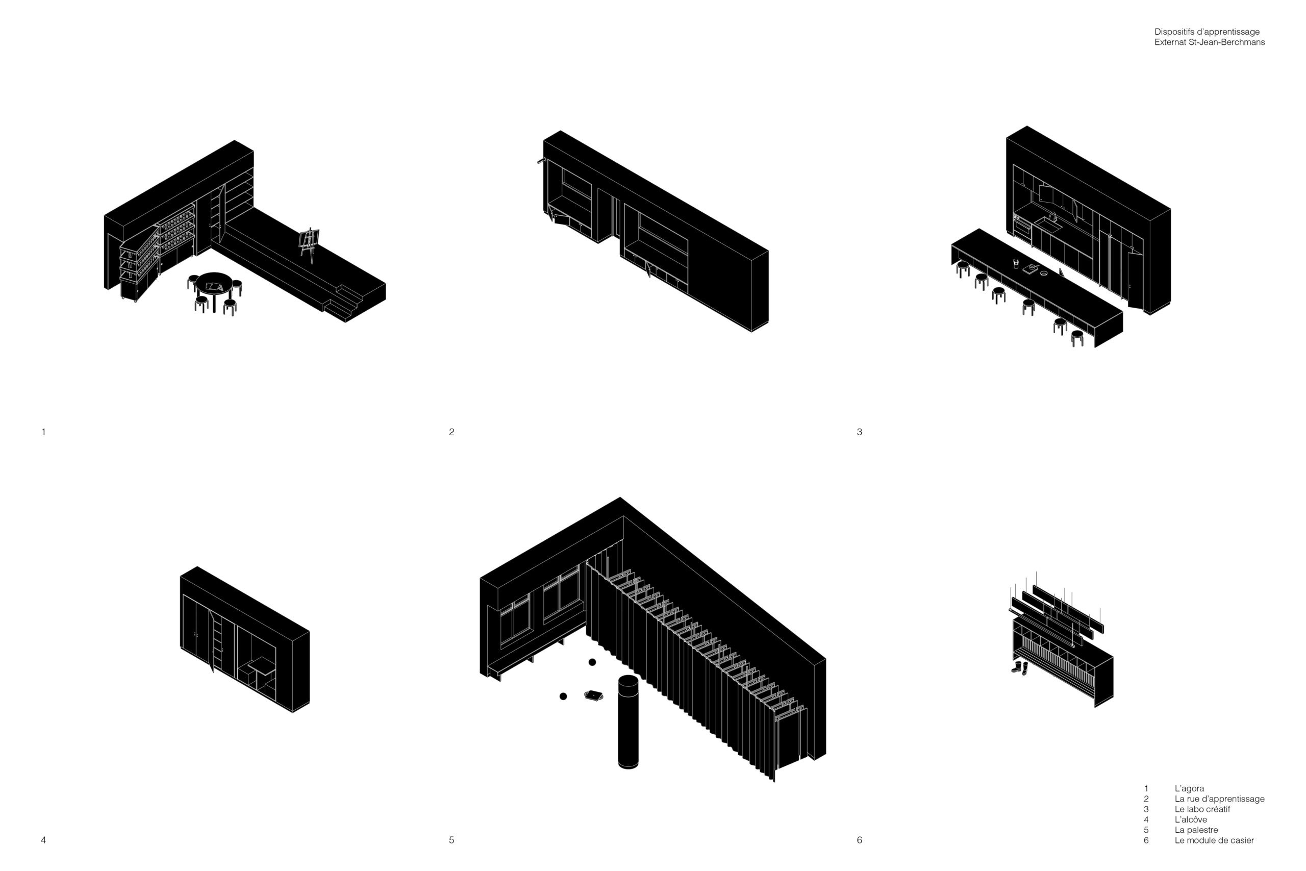 Le projet de rénovation du rez-de-chaussée de l’Externat St-Jean-Berchmans est une proposition qui intègre de nouveaux espaces communs et d’apprentissages ayant complètement transformé la vie de l’école. Il transforme un étage autrefois fonctionnel et fragmenté en un milieu de vie chaleureux et stimulant pour les élèves. Le projet est pensé autour de la typologie scolaire de la rue d’apprentissage. Celle-ci se distingue par un large corridor structurant, ponctué de zones de travail et de collaboration, mettant en dialogue les composantes programmatiques dans un environnement inspirant pour découvrir, expérimenter et apprendre.