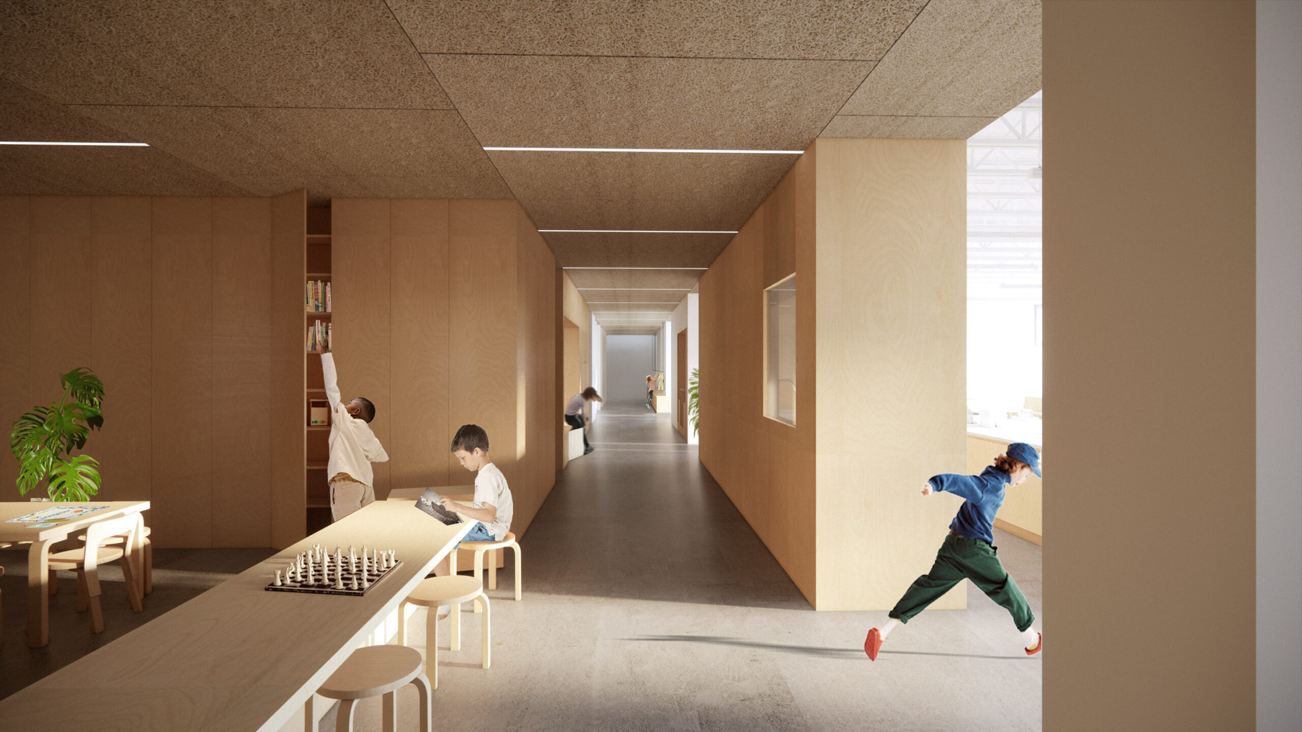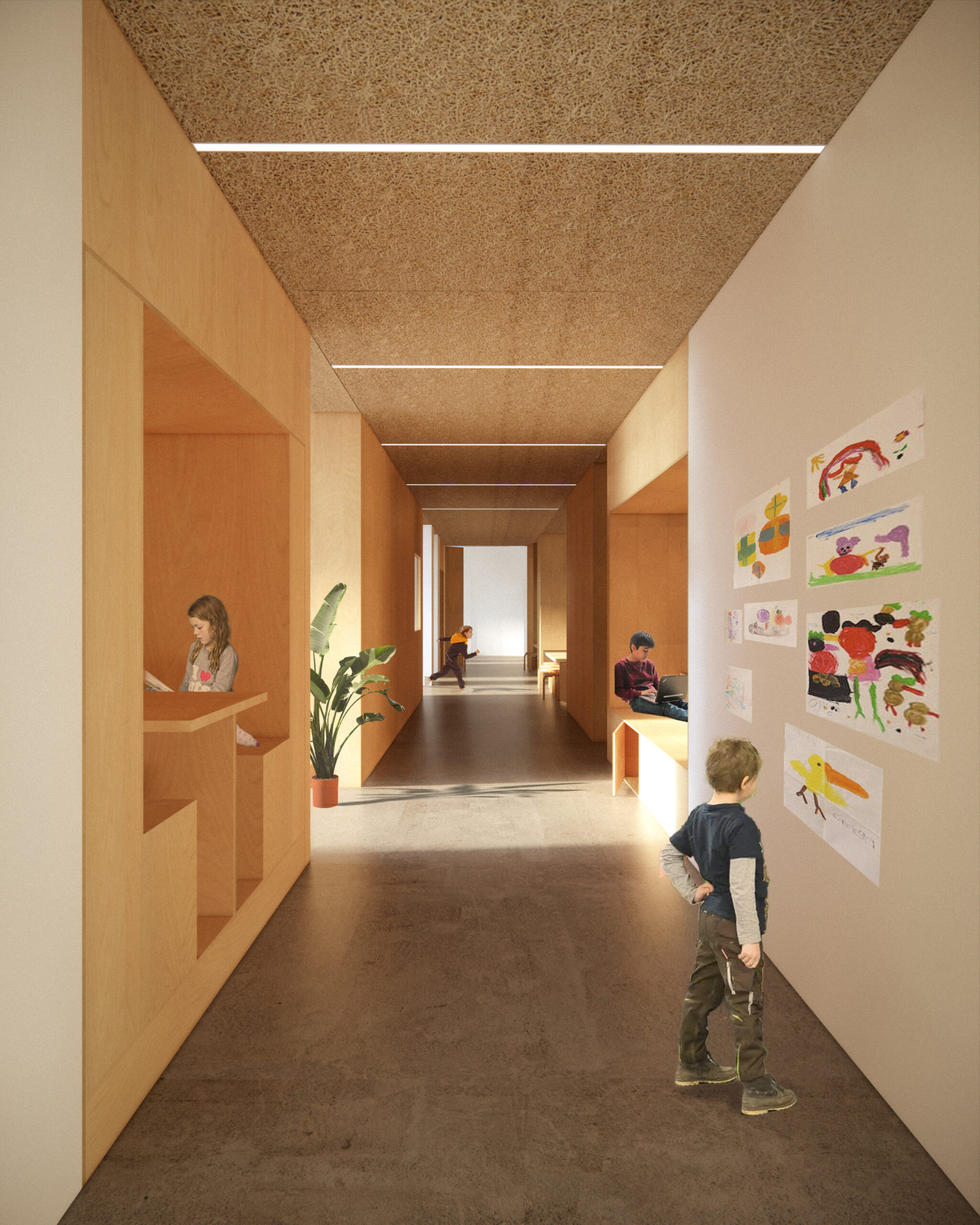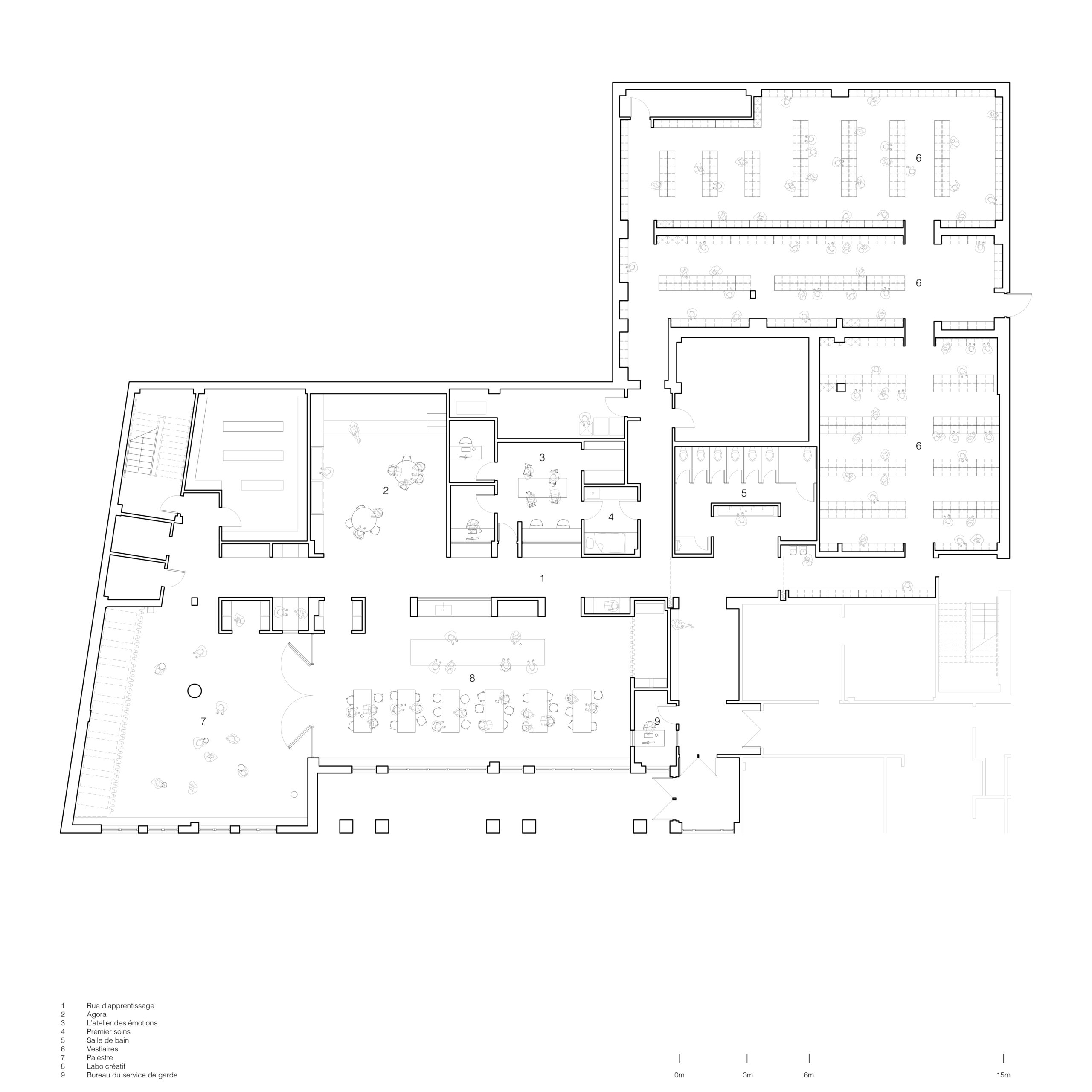 Au cœur du projet, la rue d’apprentissage structure le plan et transforme la circulation en un espace appropriable, vivant et inspirant. Les murs épais, creusés et façonnés, génèrent des usages variés : assises, tables ou rangements. Le labo créatif, la palestre et l’agora offrent des configurations multiples pour des cours, jeux, collaborations, repas ou moments de pause. La diversité des échelles, la qualité de la lumière et des textures rendent ces espaces vivants, flexibles et adaptés aux besoins pédagogiques.