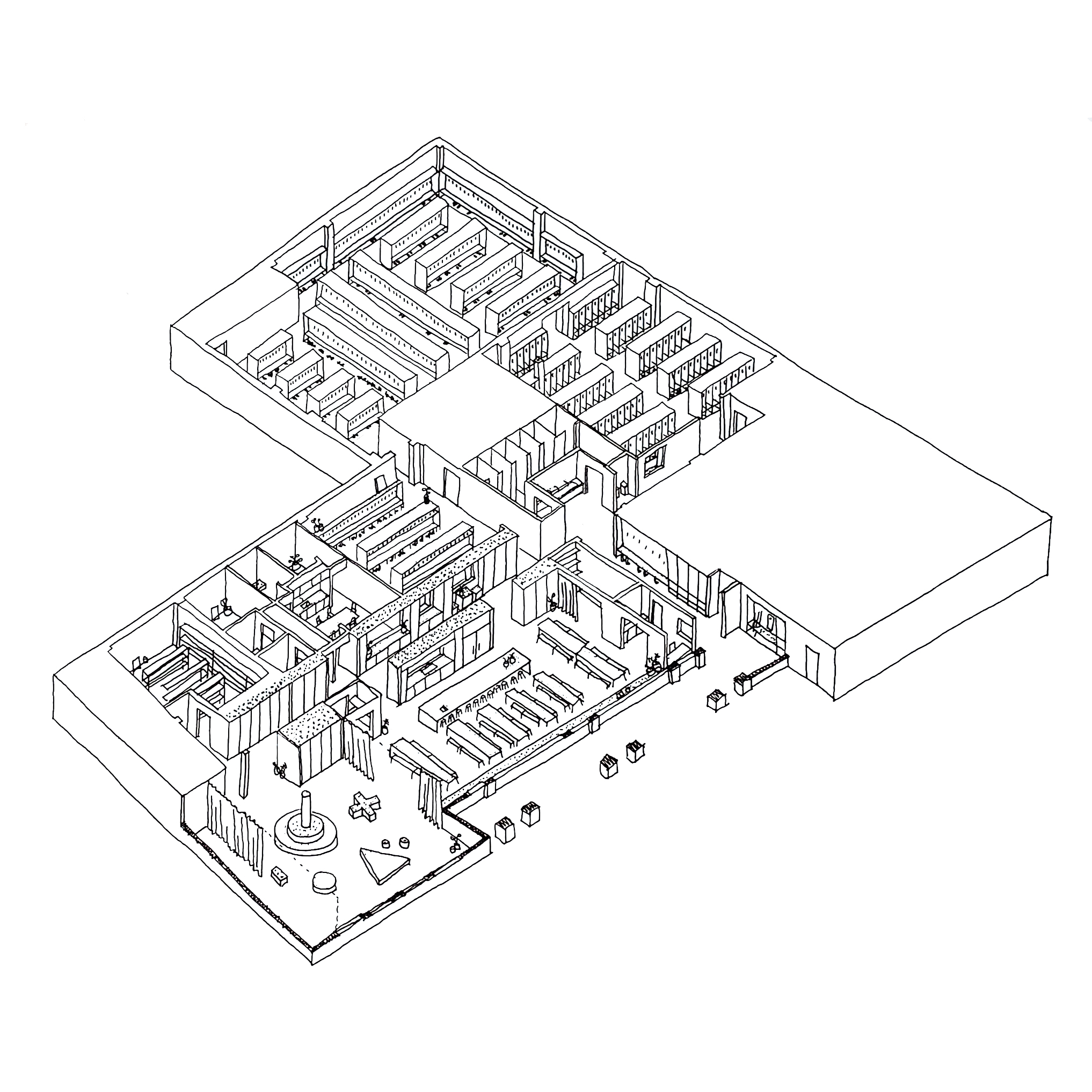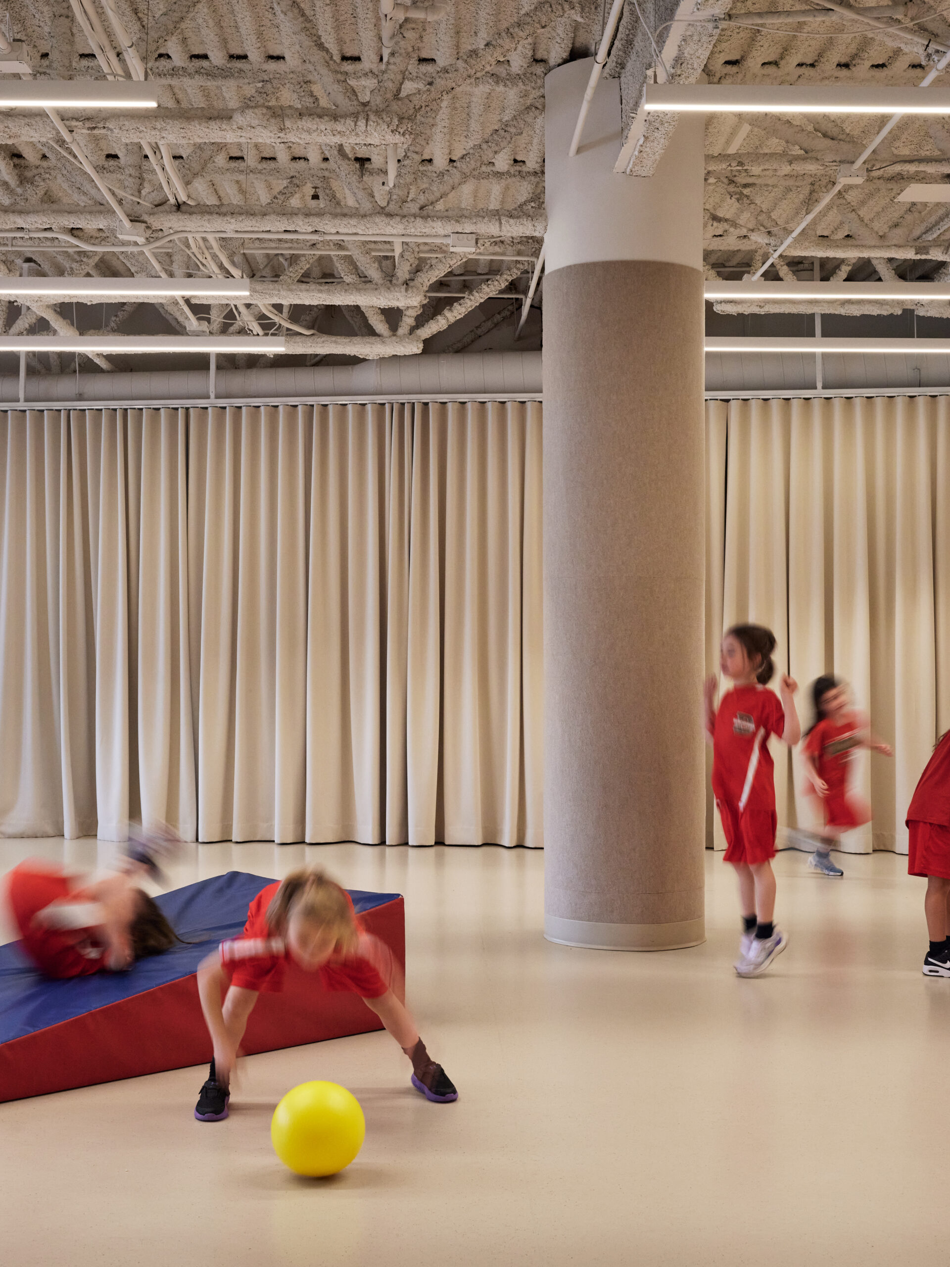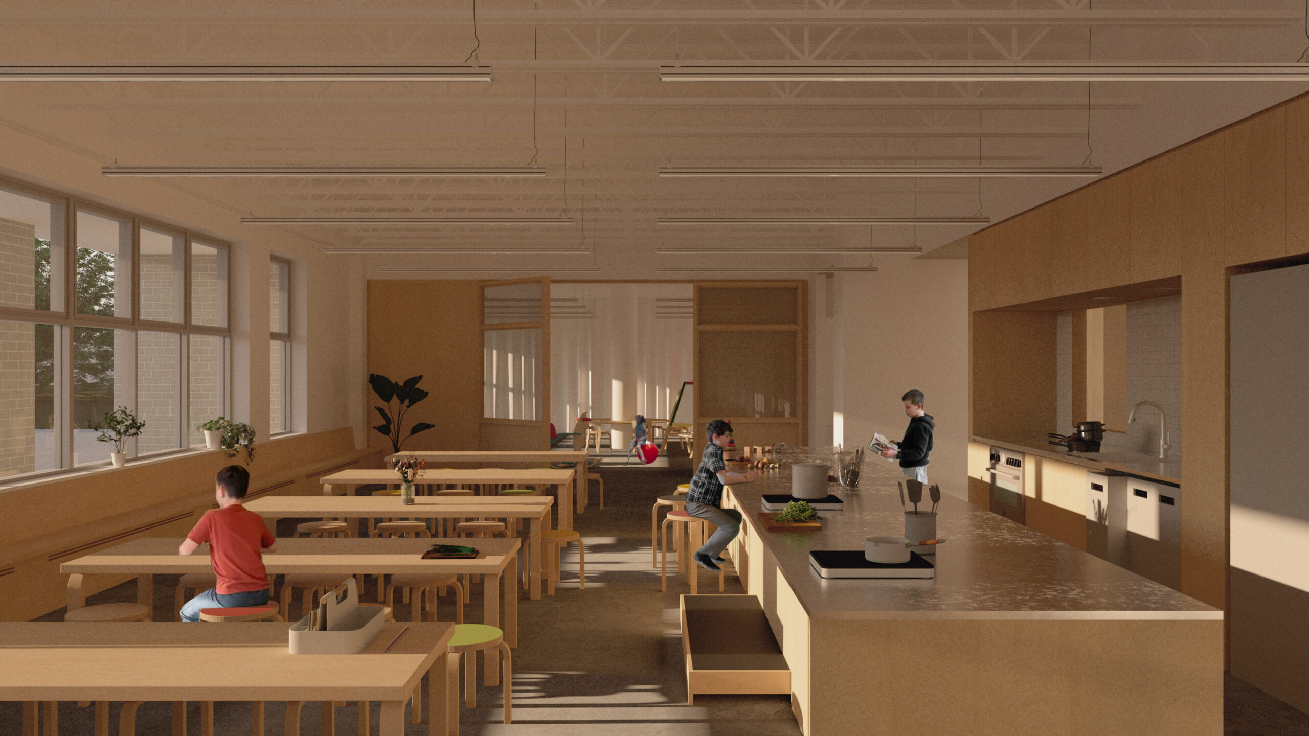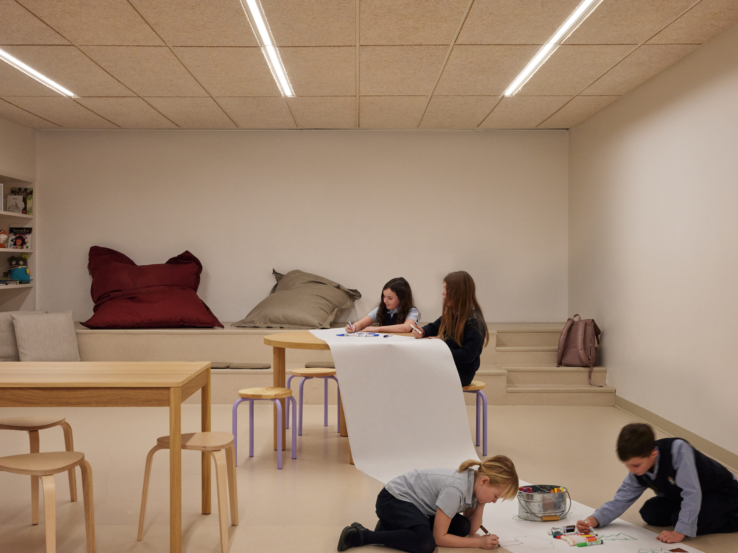 Au cœur du projet, la rue d’apprentissage structure le plan et transforme la circulation en un espace appropriable, vivant et inspirant. Les murs épais, creusés et façonnés, génèrent des usages variés : assises, tables ou rangements. Le labo créatif, la palestre et l’agora offrent des configurations multiples pour des cours, jeux, collaborations, repas ou moments de pause. La diversité des échelles, la qualité de la lumière et des textures rendent ces espaces vivants, flexibles et adaptés aux besoins pédagogiques.