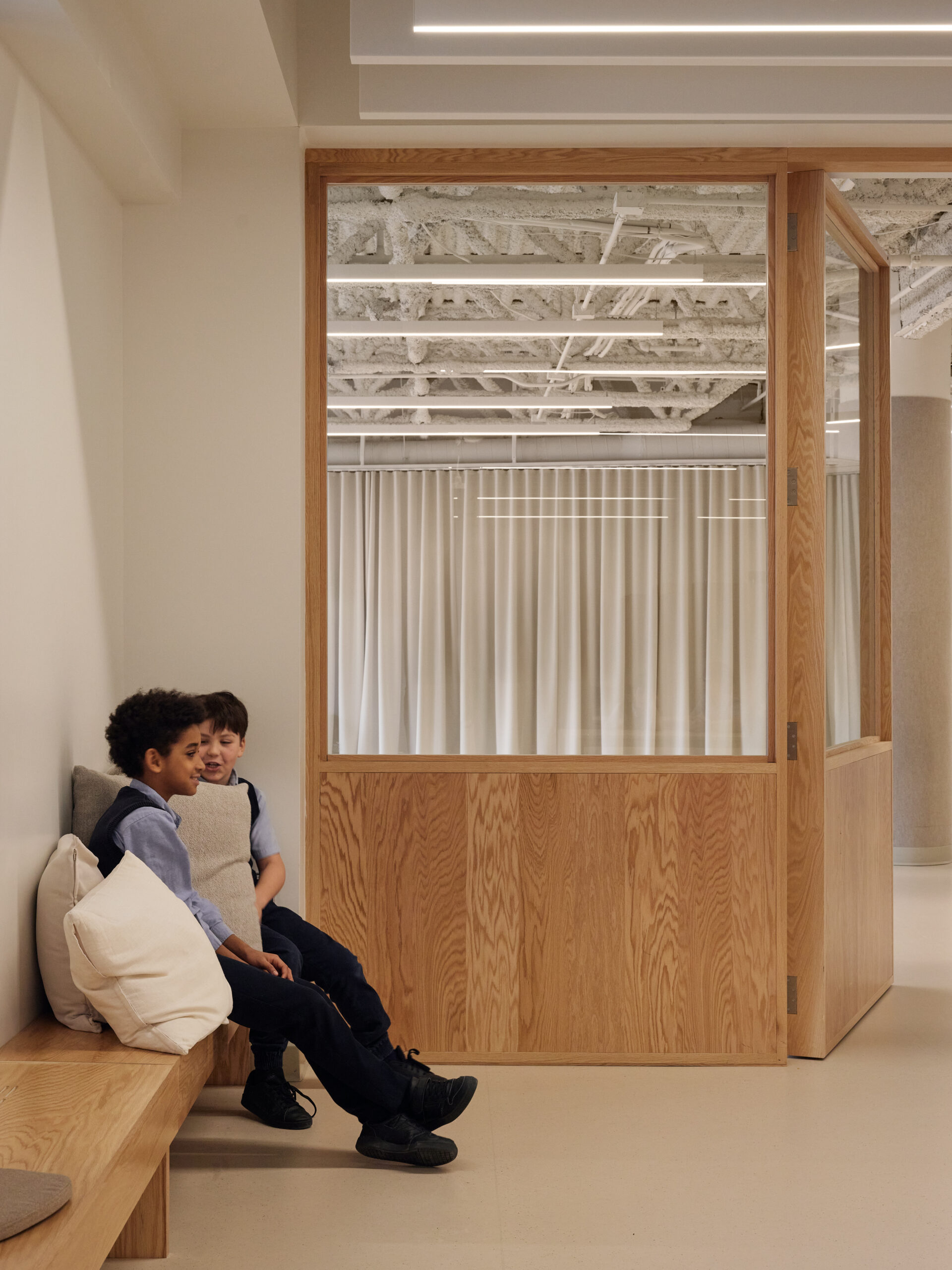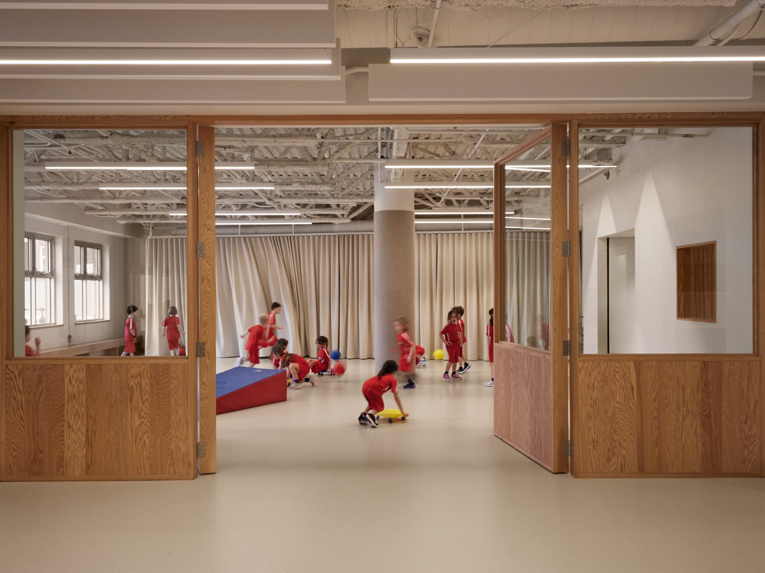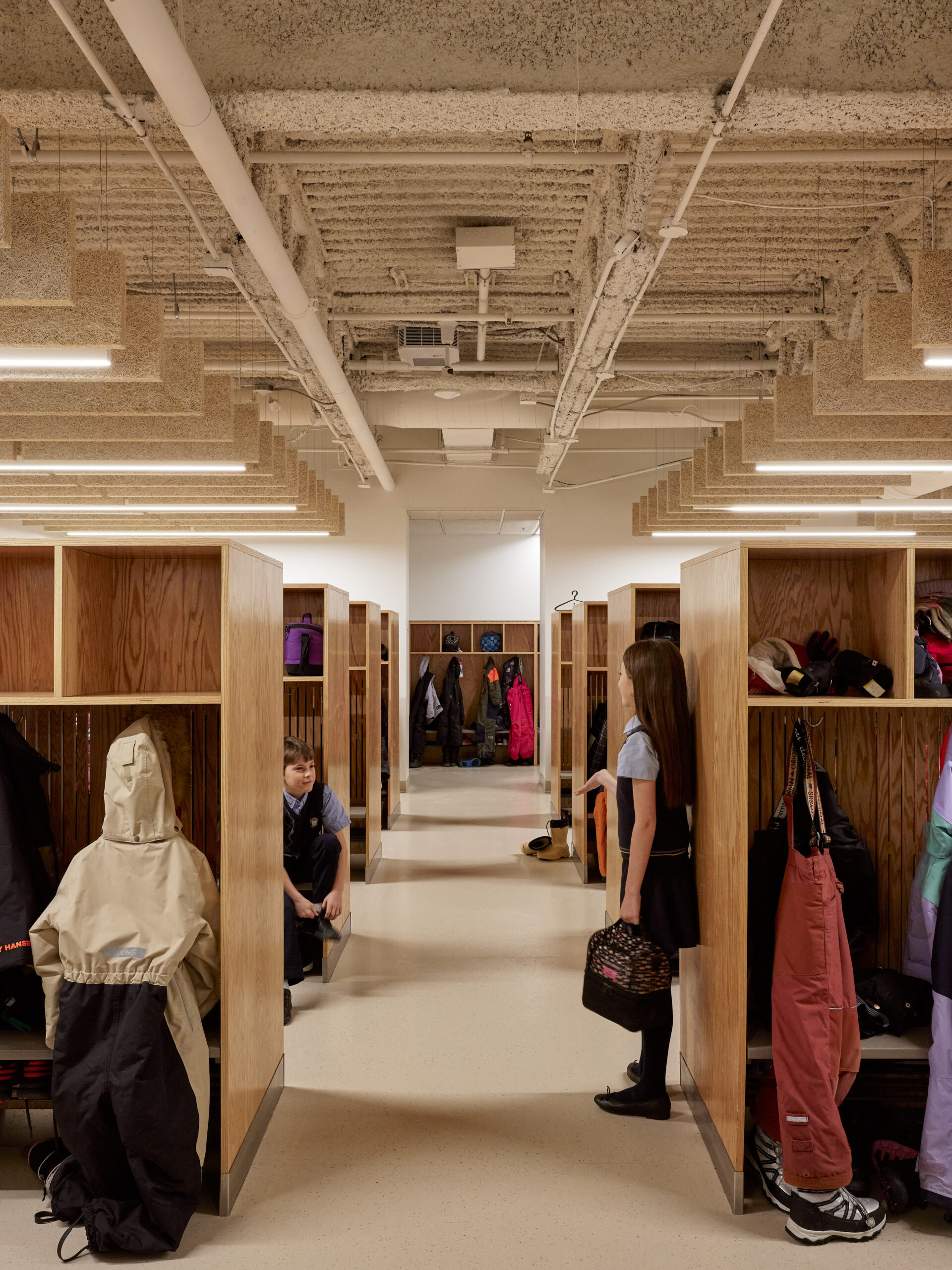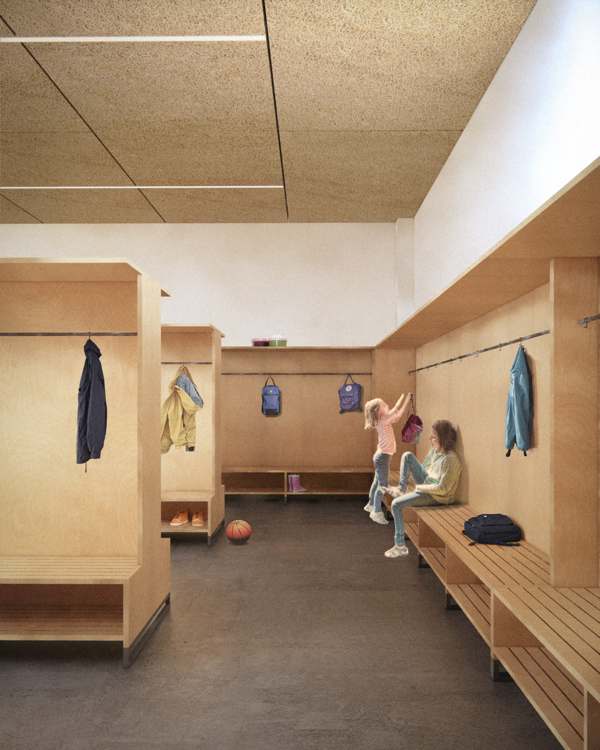 Dès l’entrée, les vestiaires et les circulations sont repensés comme des lieux d’accueil conviviaux, à hauteur d’enfant. Organisés en petites communautés, à l’image de places publiques, les zones de vestiaires favorisent l’appropriation et la rencontre. Soigneusement dimensionnés pour les besoins des élèves, ils deviennent des espaces informels de vie quotidienne et d’apprentissage, où chaque matin l’élève est accueilli.