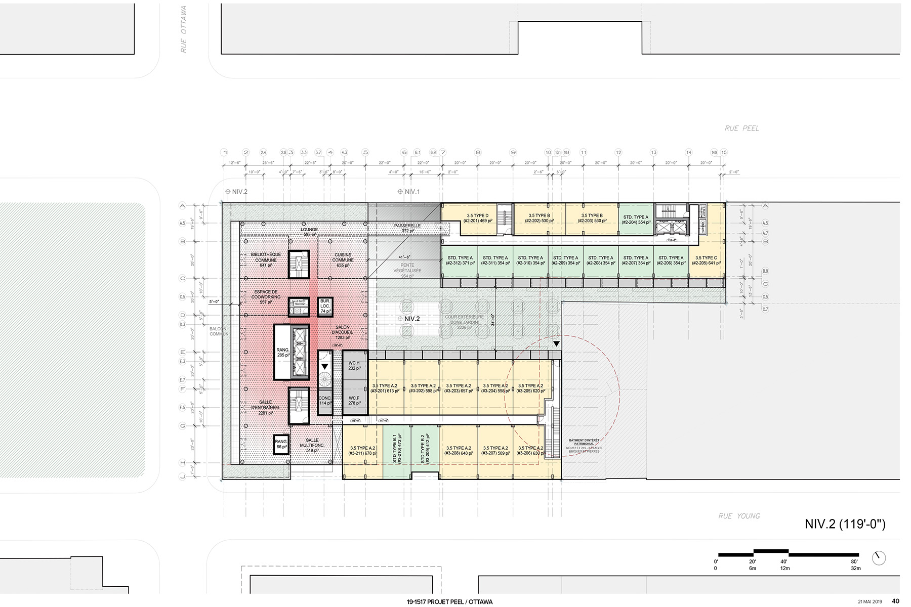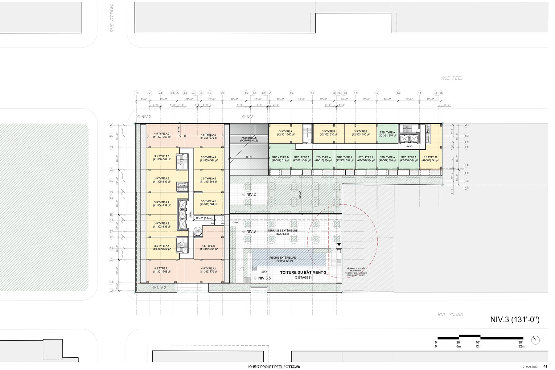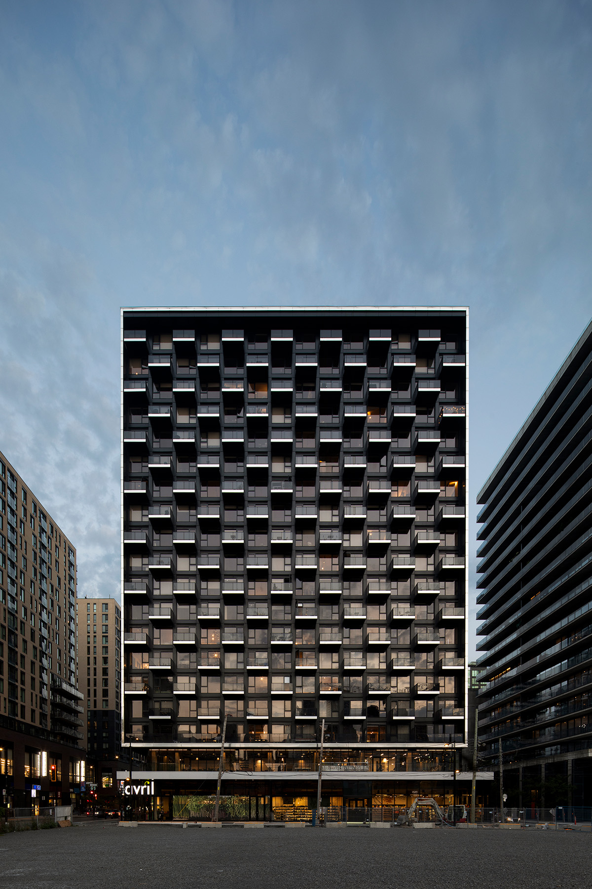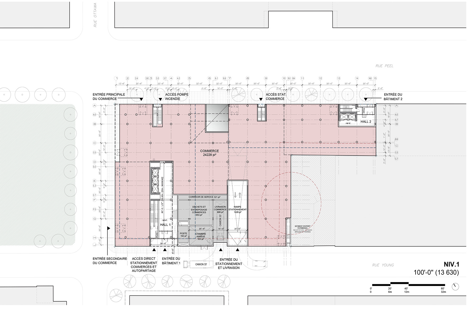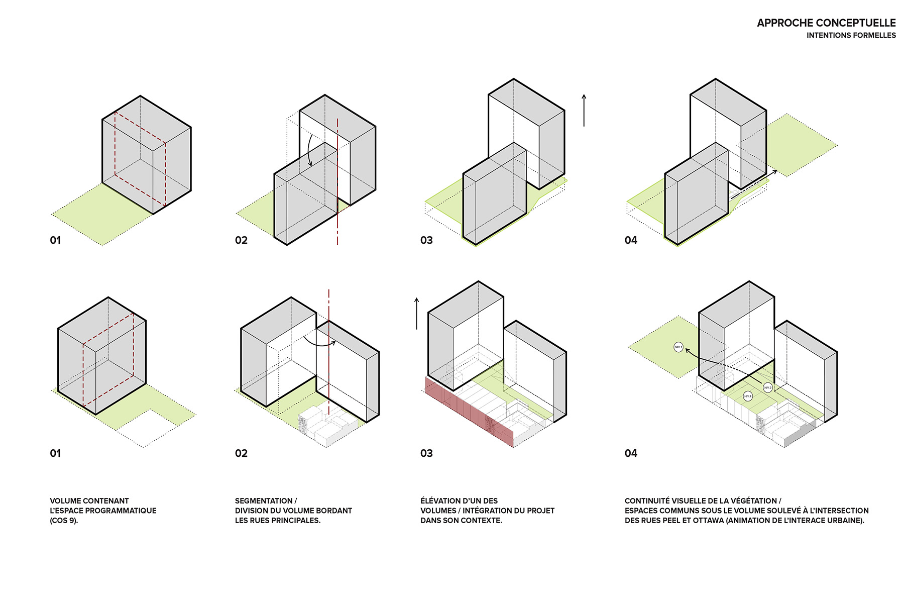 La composition repose sur une organisation lisible des masses bâties. Deux tours distinctes de 16 et 18 étages sont reliées par une passerelle vitrée implantée au-dessus d’une place commerciale de faible emprise. Cette configuration assure une desserte fonctionnelle des commerces du rez-de-chaussée tout en créant une respiration piétonne le long de la rue Peel, axe structurant nord-sud du secteur.