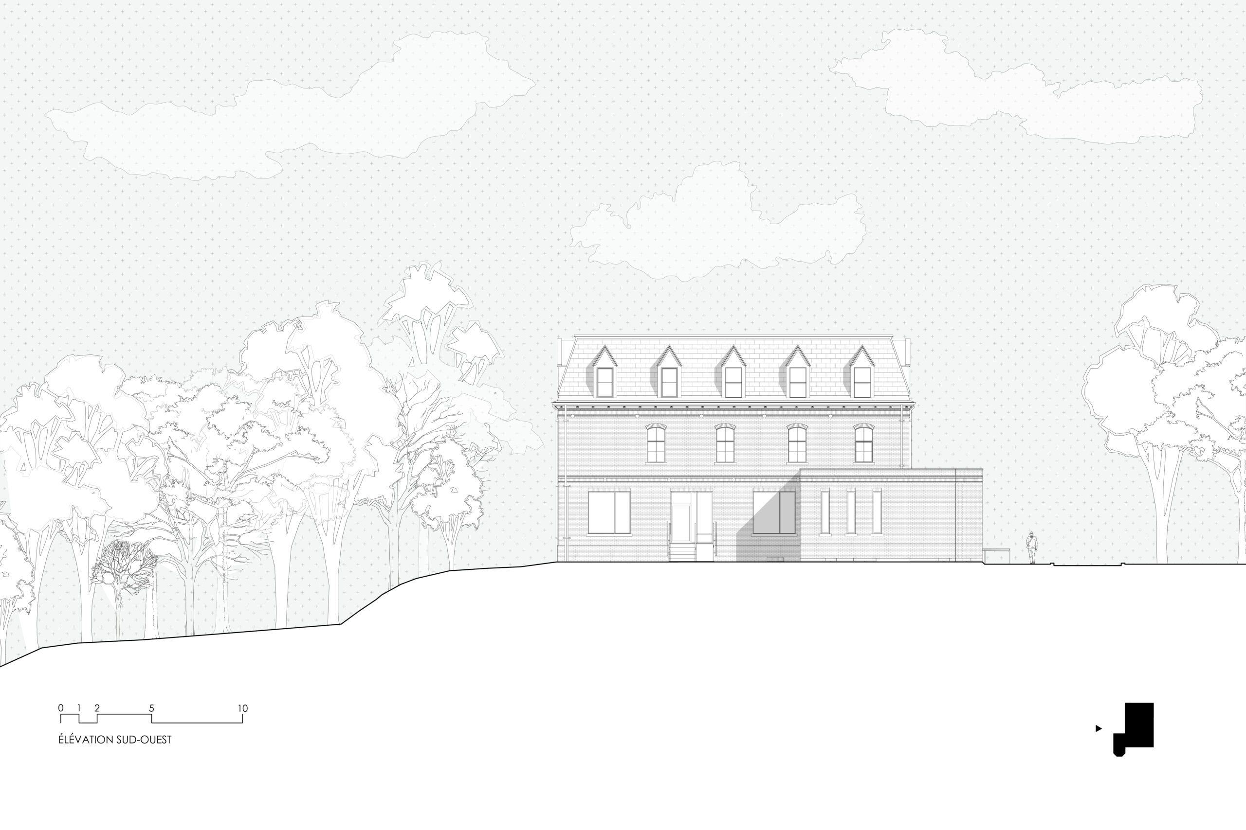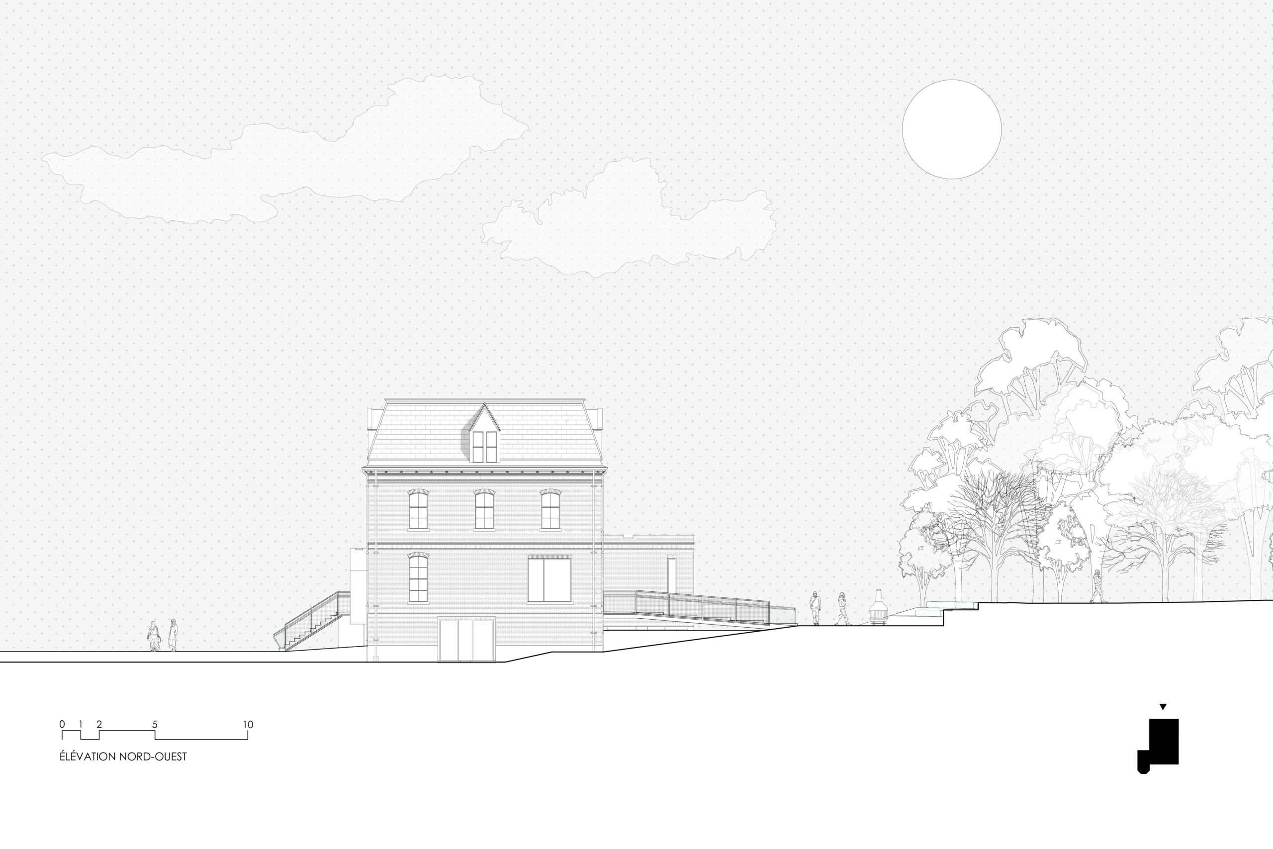Les architectes relèvent le défi de convertir un bâtiment introverti et vétuste en un espace accueillant mis aux normes d’aujourd’hui, sans en modifier l’empreinte au sol. La restauration rigoureuse de l’enveloppe patrimoniale — reconstruction du toit mansardé et des lucarnes, revitalisation de la maçonnerie de brique rouge — s’allie à une restructuration intérieure ambitieuse.