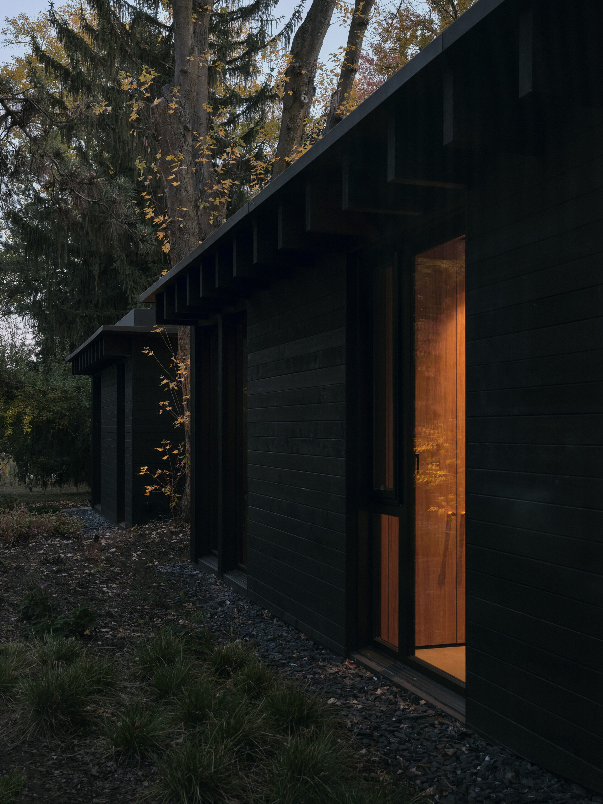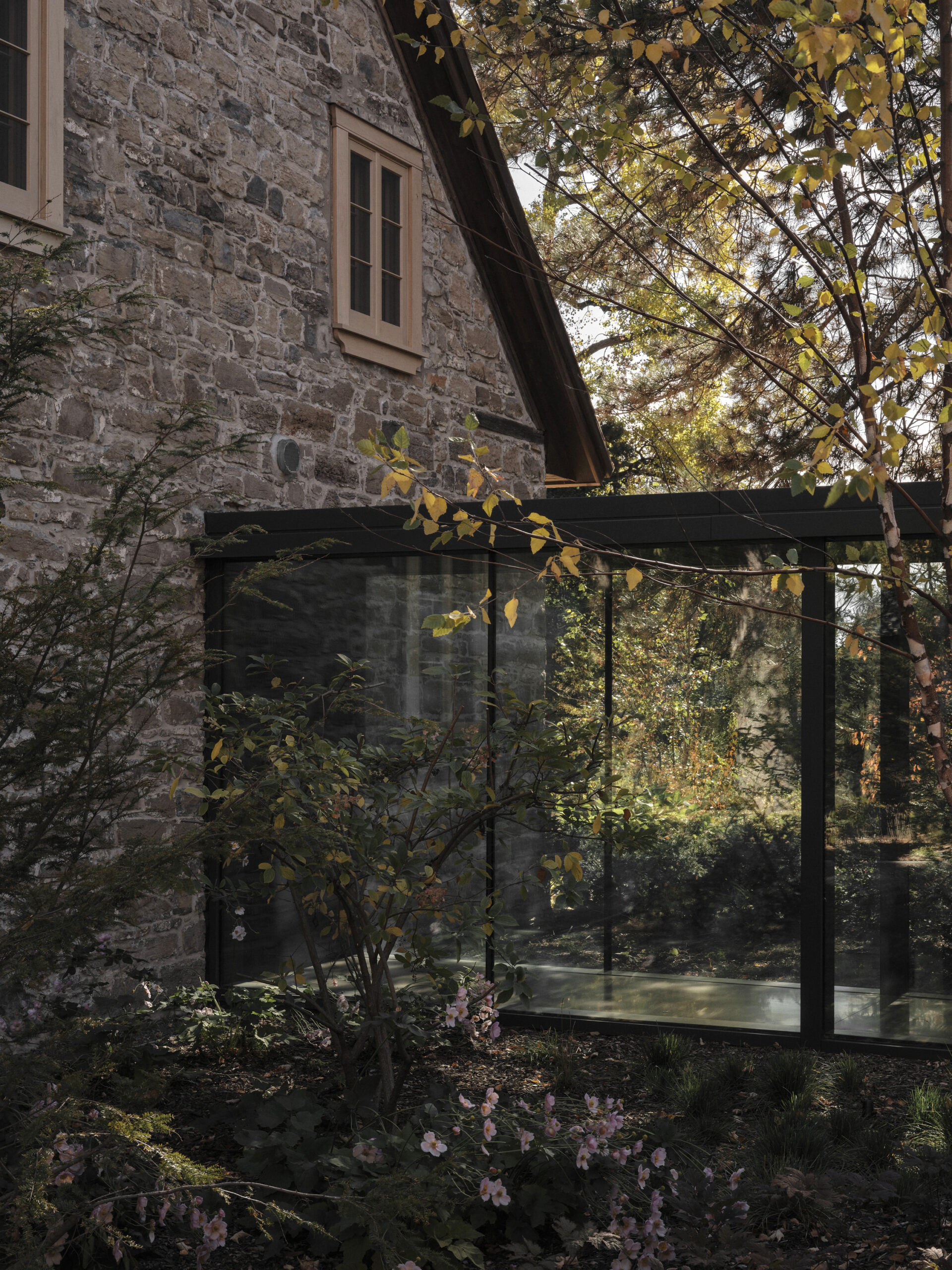 L’agrandissement contemporain, volontairement discret, s’insère entre les arbres matures du jardin. Sa volumétrie se dilate et se contracte pour préserver la nature existante. L’agrandissement s’organise le long d’une rampe centrale épousant la pente naturelle du terrain. Les matériaux — cèdre teinté ébène, bois sombre et toiture de galets — assurent une intégration paysagère sensible. Un passage vitré relie les deux bâtiments, agissant comme un seuil entre héritage et modernité.