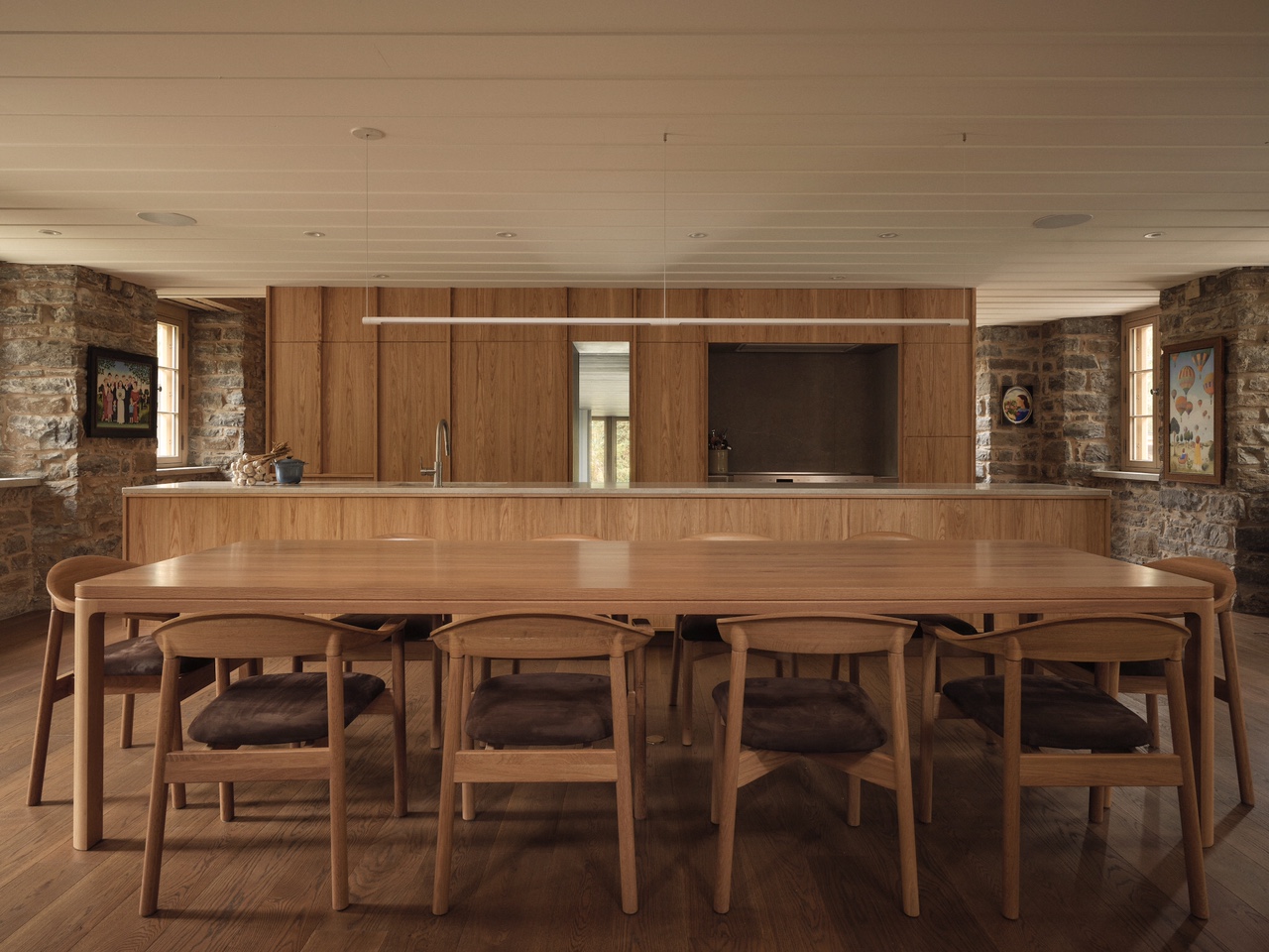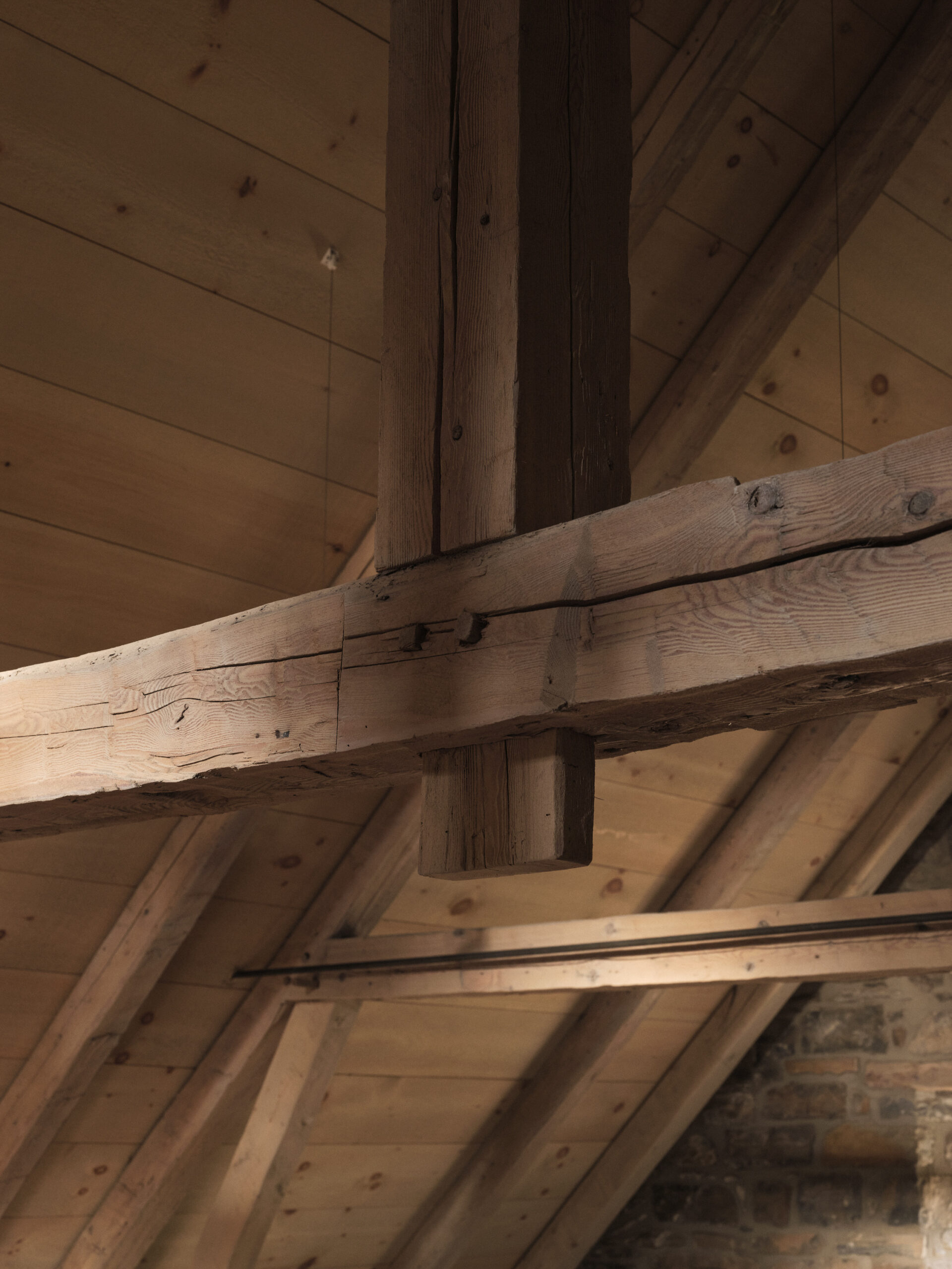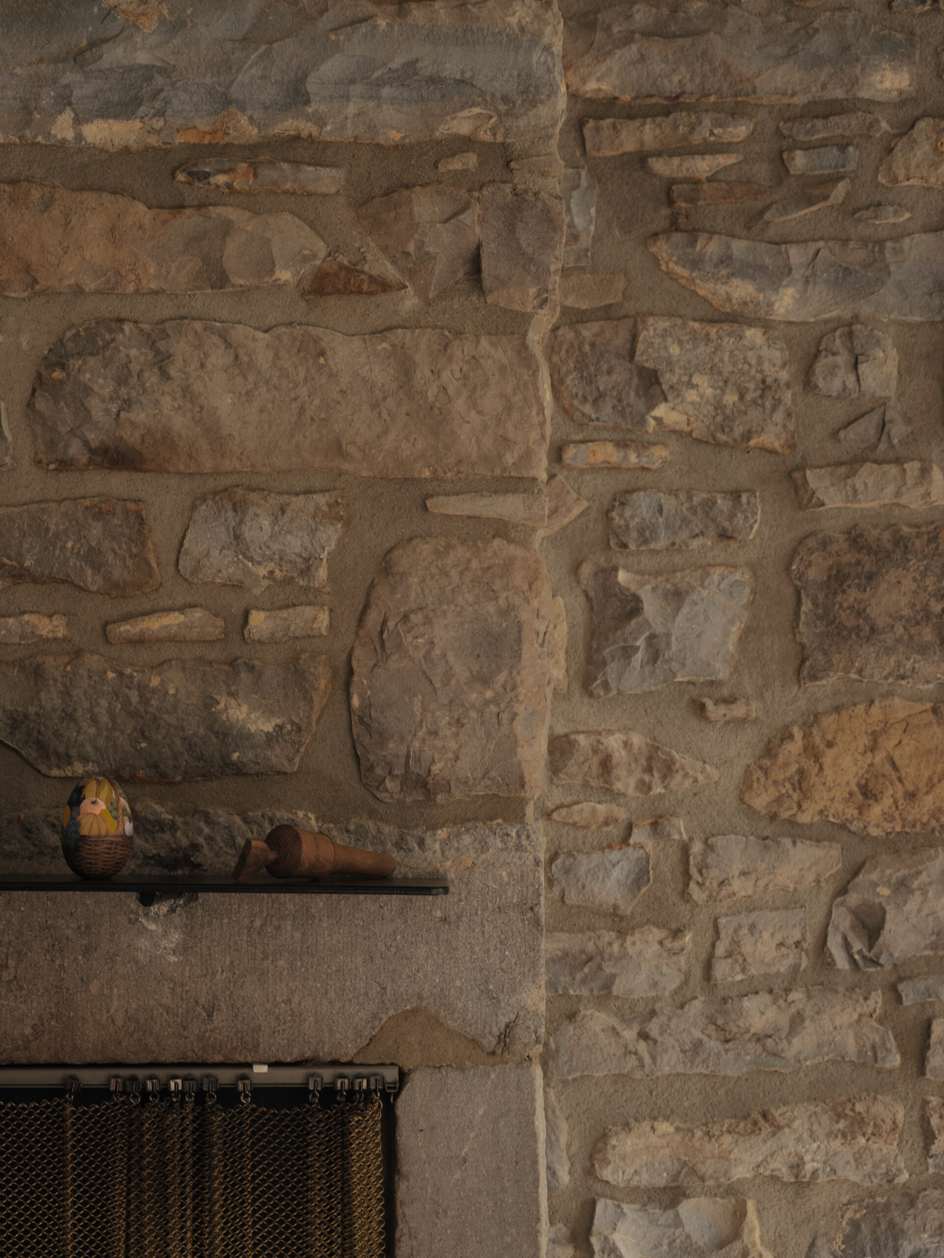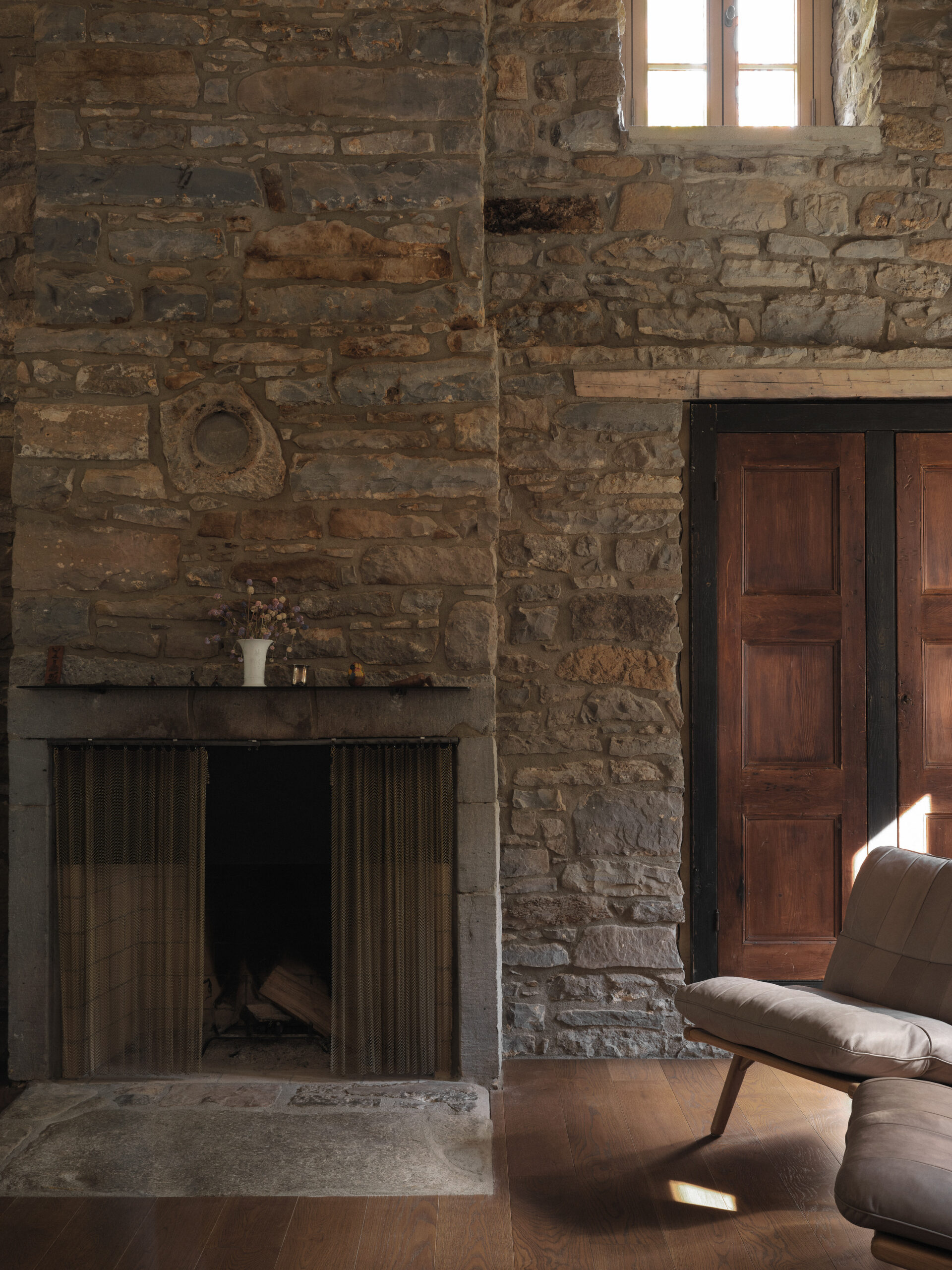 Le projet repose sur une démarche rigoureuse de restauration et de réinterprétation. L’enveloppe extérieure retrouve la pureté de ses formes initiales grâce à la démolition d’un agrandissement existant, au remplacement des ouvertures dans le respect des proportions d’origine et à la réfection de la toiture en bardeau de cèdre. À l’intérieur, la charpente apparente, les murs de pierre et le foyer central sont magnifiés, révélant l’authenticité matérielle de la maison. Une nouvelle double hauteur structure l’espace de vie principal et permet une lecture renouvelée de la charpente.