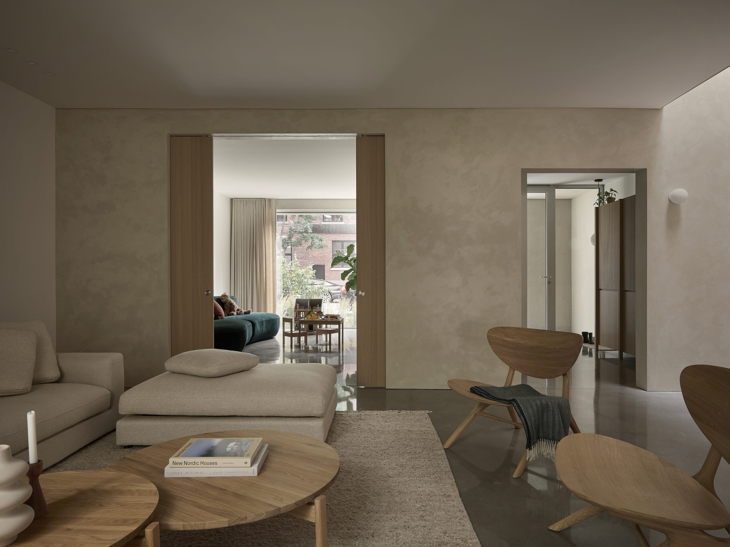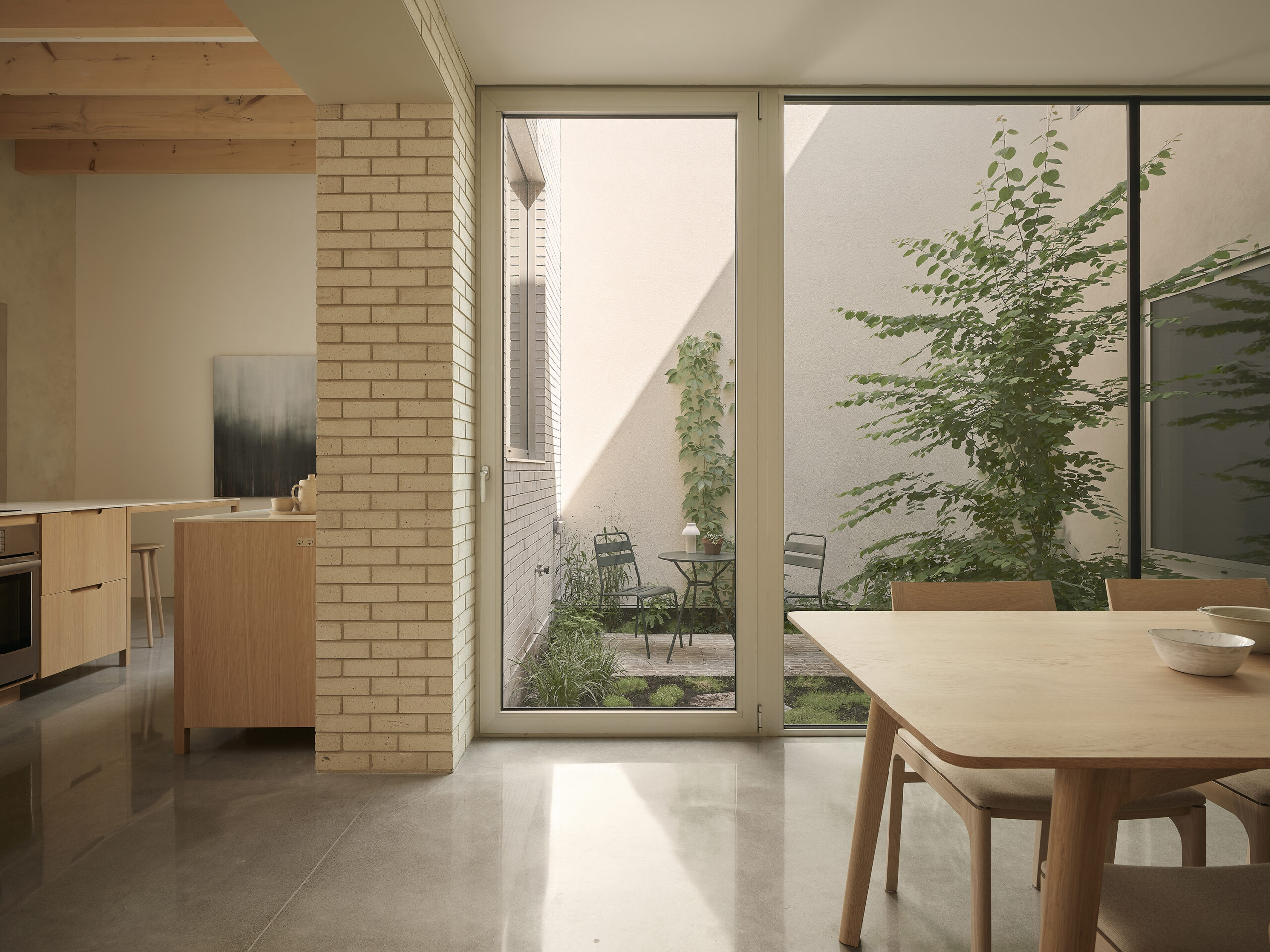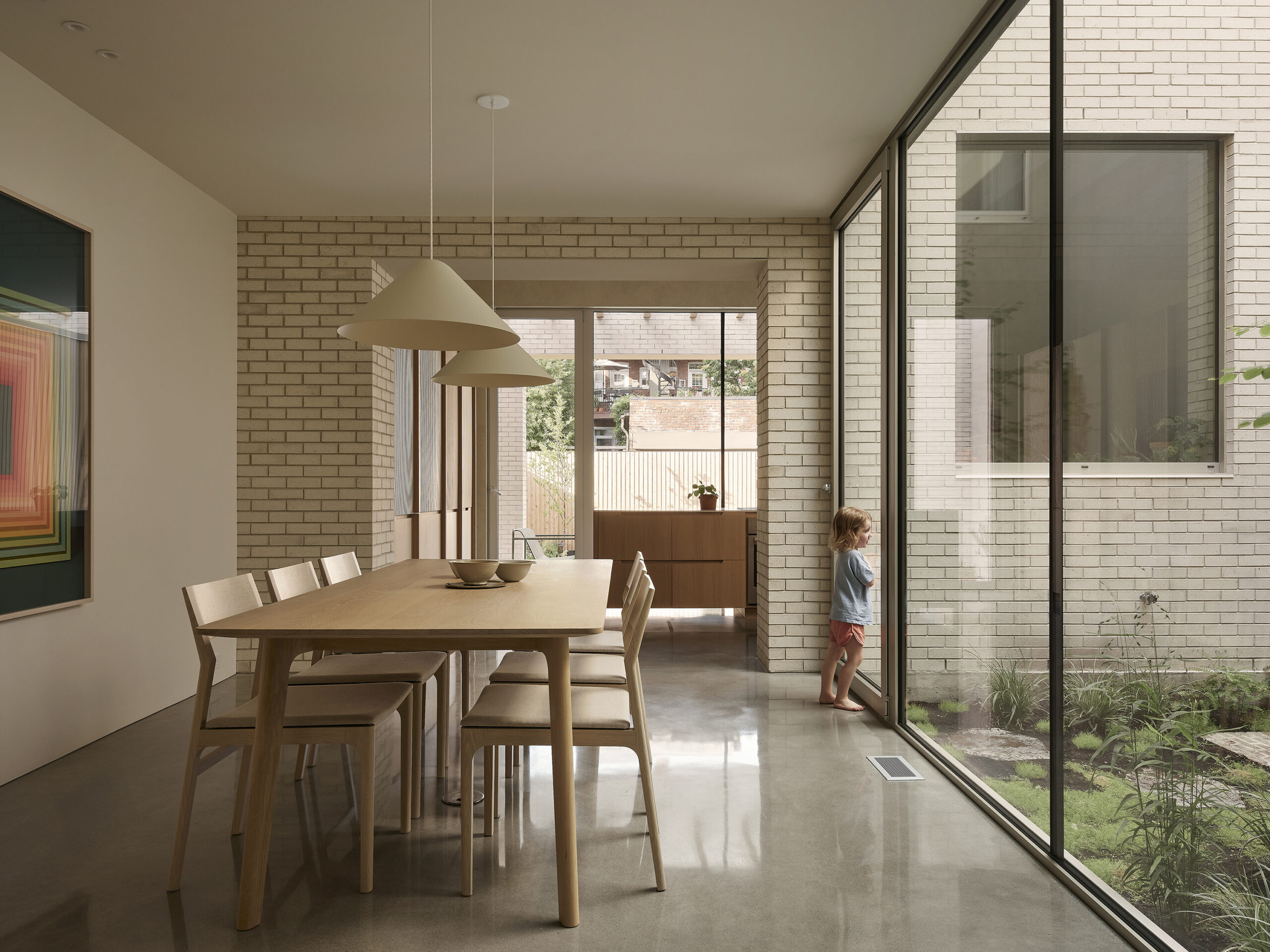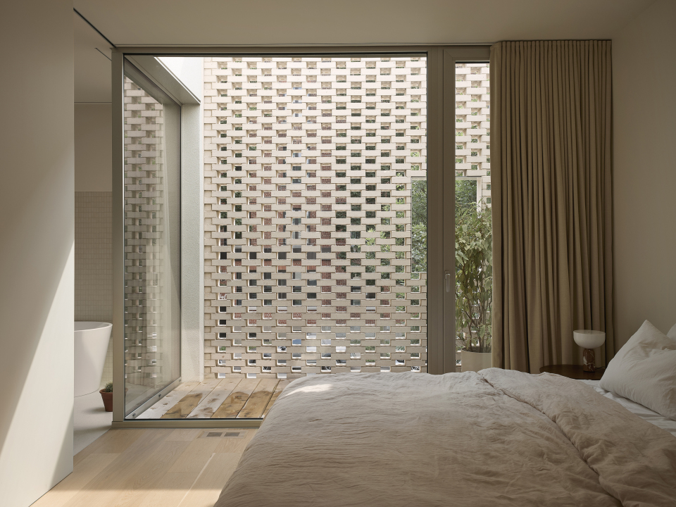 Sans contraintes de conservation patrimoniale strictes, la façade s’ancre dans l’ère contemporaine tout en dialoguant avec son histoire. Elle se compose de deux volumes superposés : un rez-de-chaussée en briques pleines évoquant le shoebox d’origine, et un étage supérieur en dentelle de brique vaporeuse qui crée un ajout diaphane. Cette matérialité filtre la lumière et préserve l’intimité tout en affirmant une esthétique contemporaine.