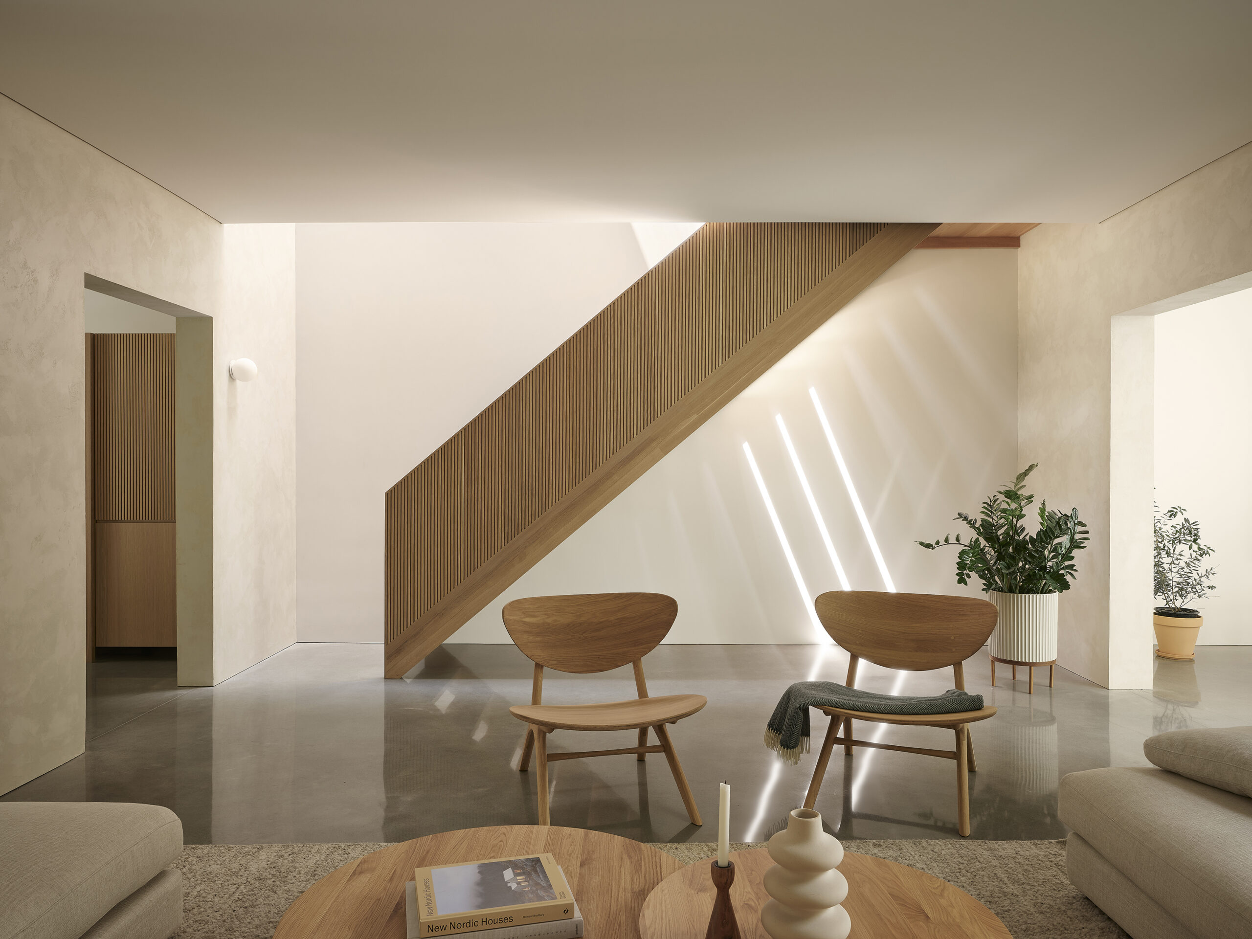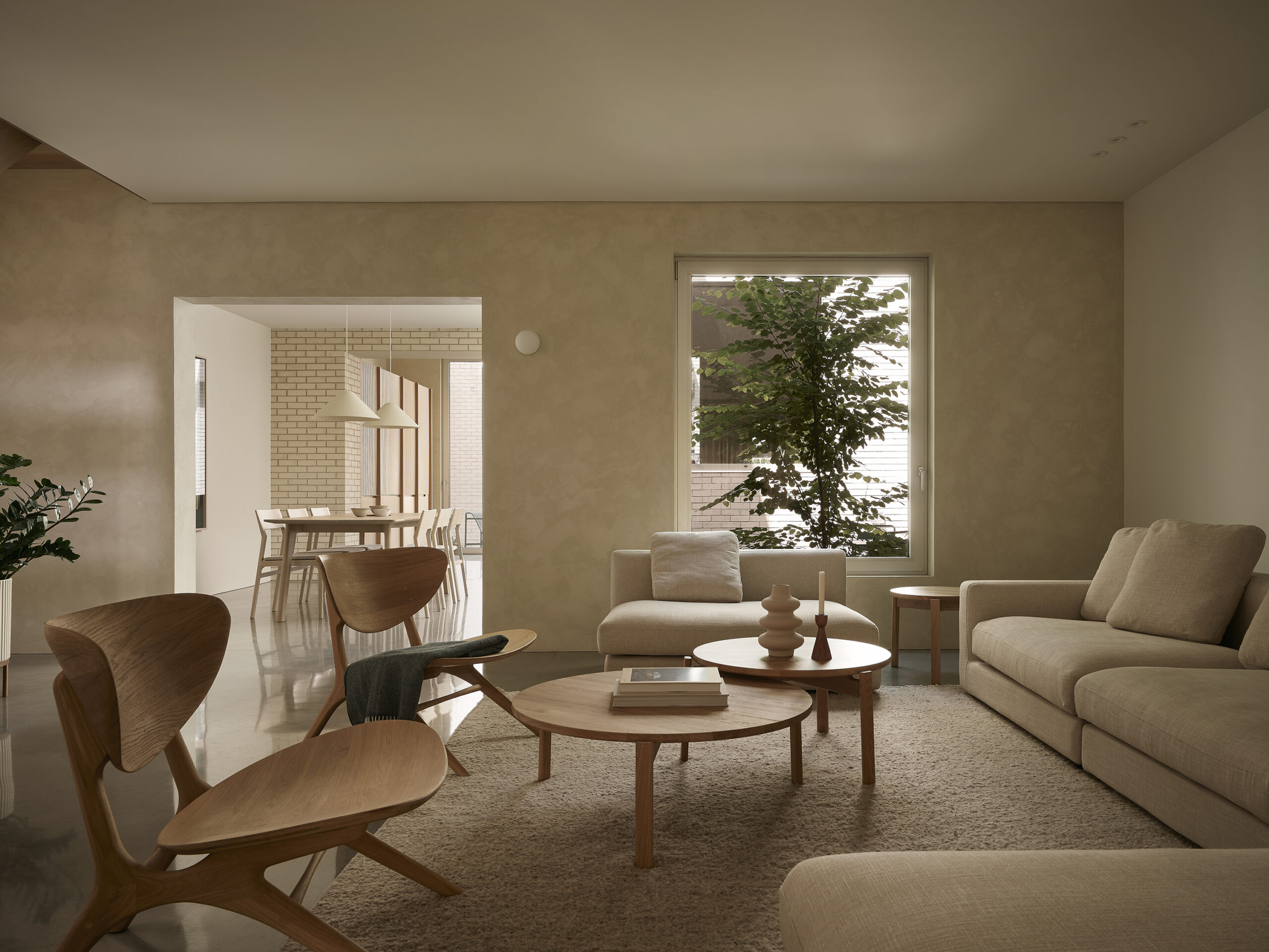 Le concept se déploie par une succession de plans verticaux perforés créant des ouvertures variées selon le degré d’intimité souhaité. Cette approche génère une richesse spatiale et des jeux de regards subtils entre les espaces. Les matériaux locaux, chaux, brique, bois, béton, créent une atmosphère douce et lumineuse.