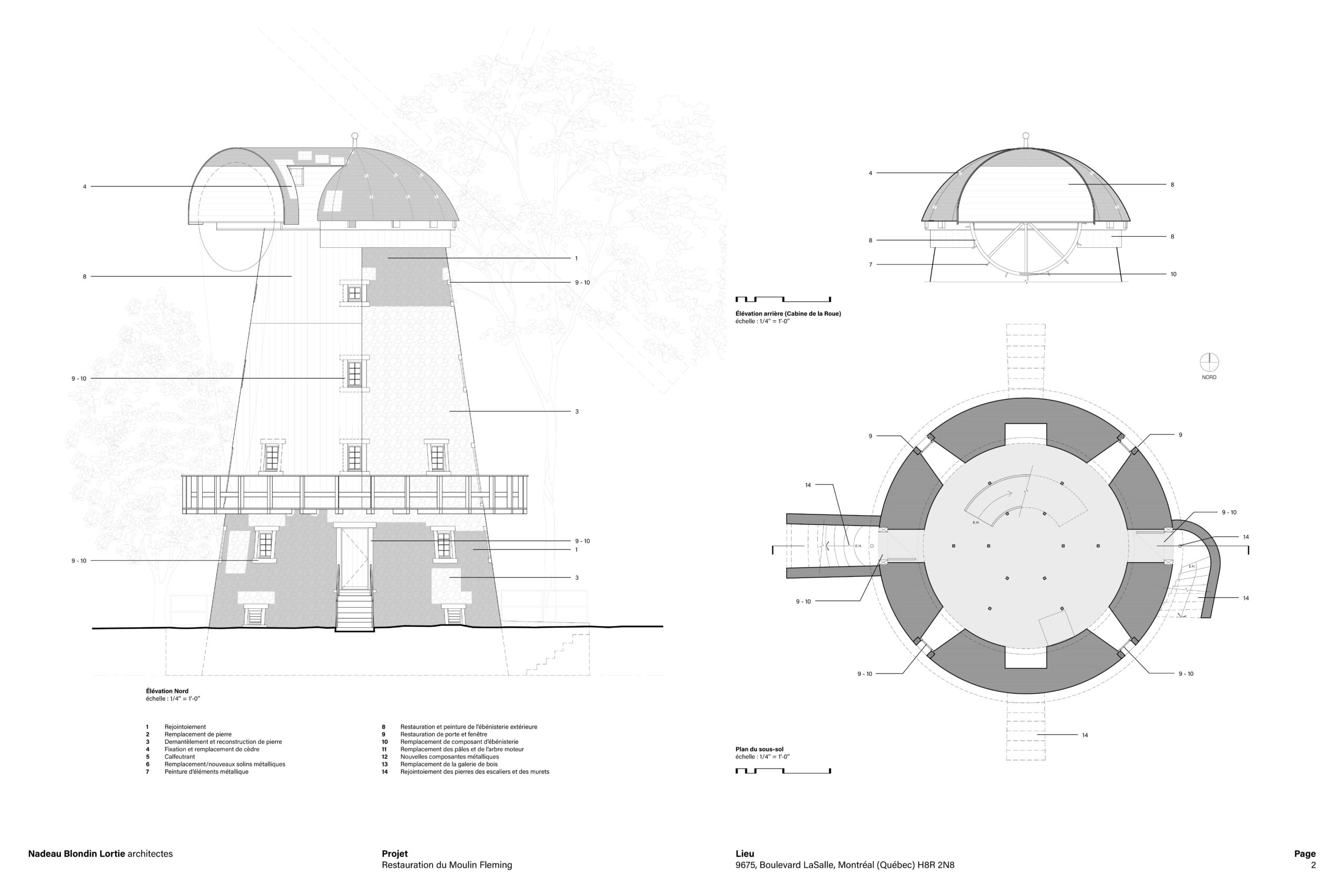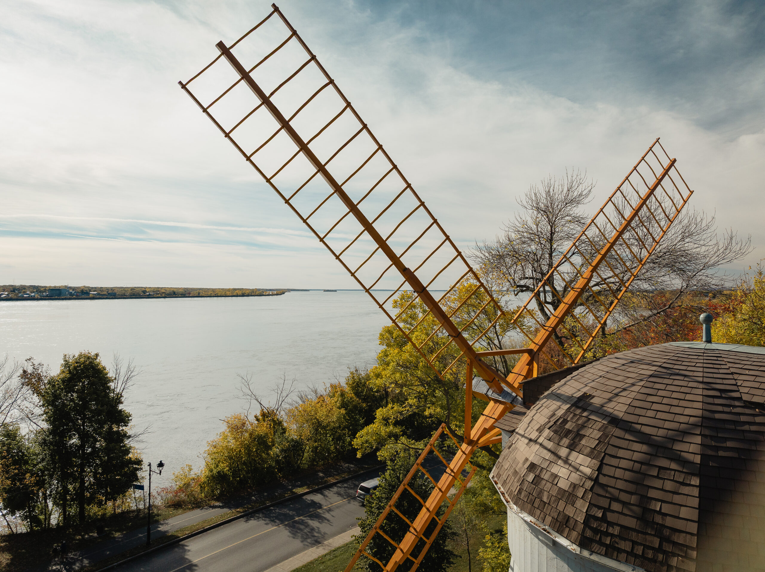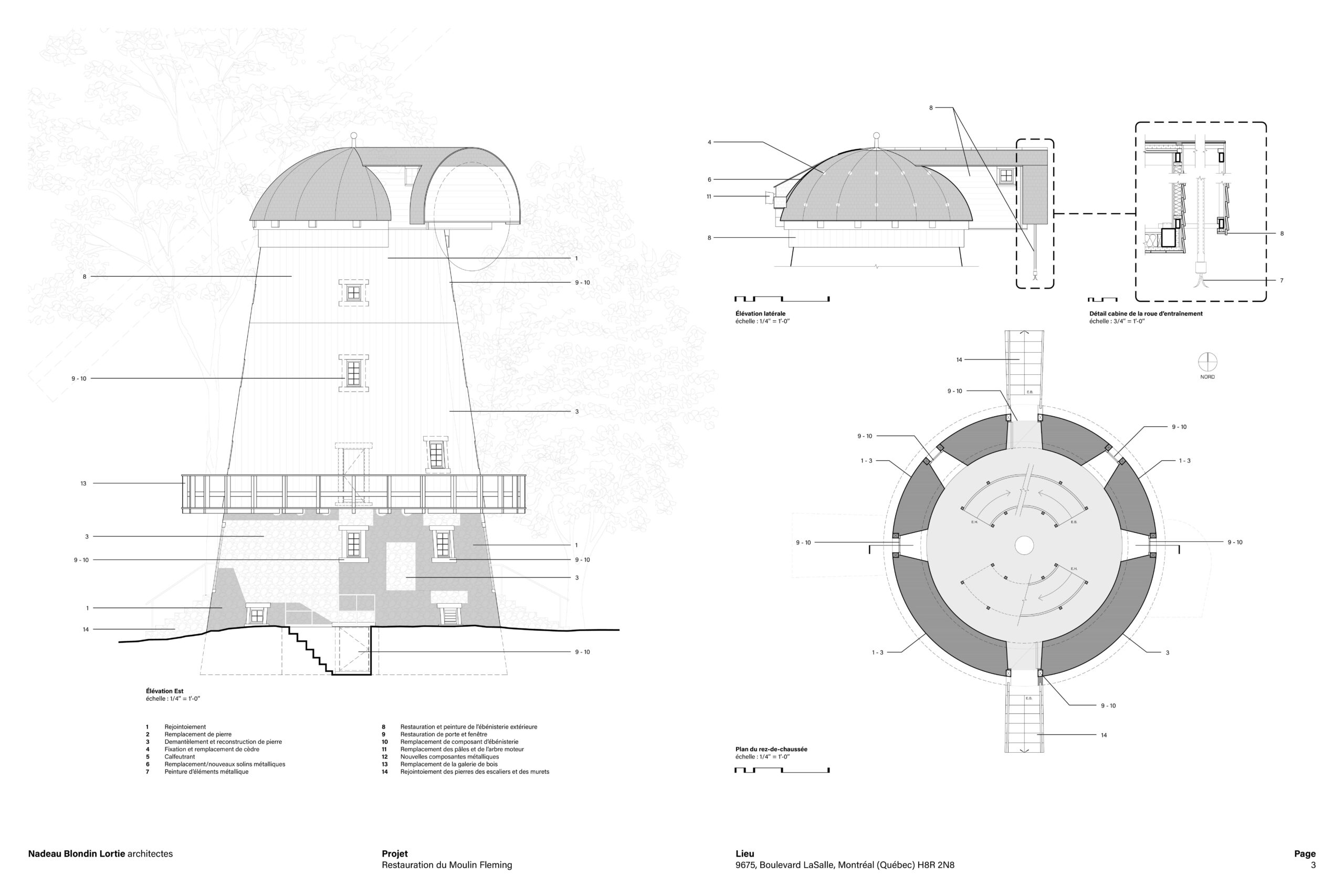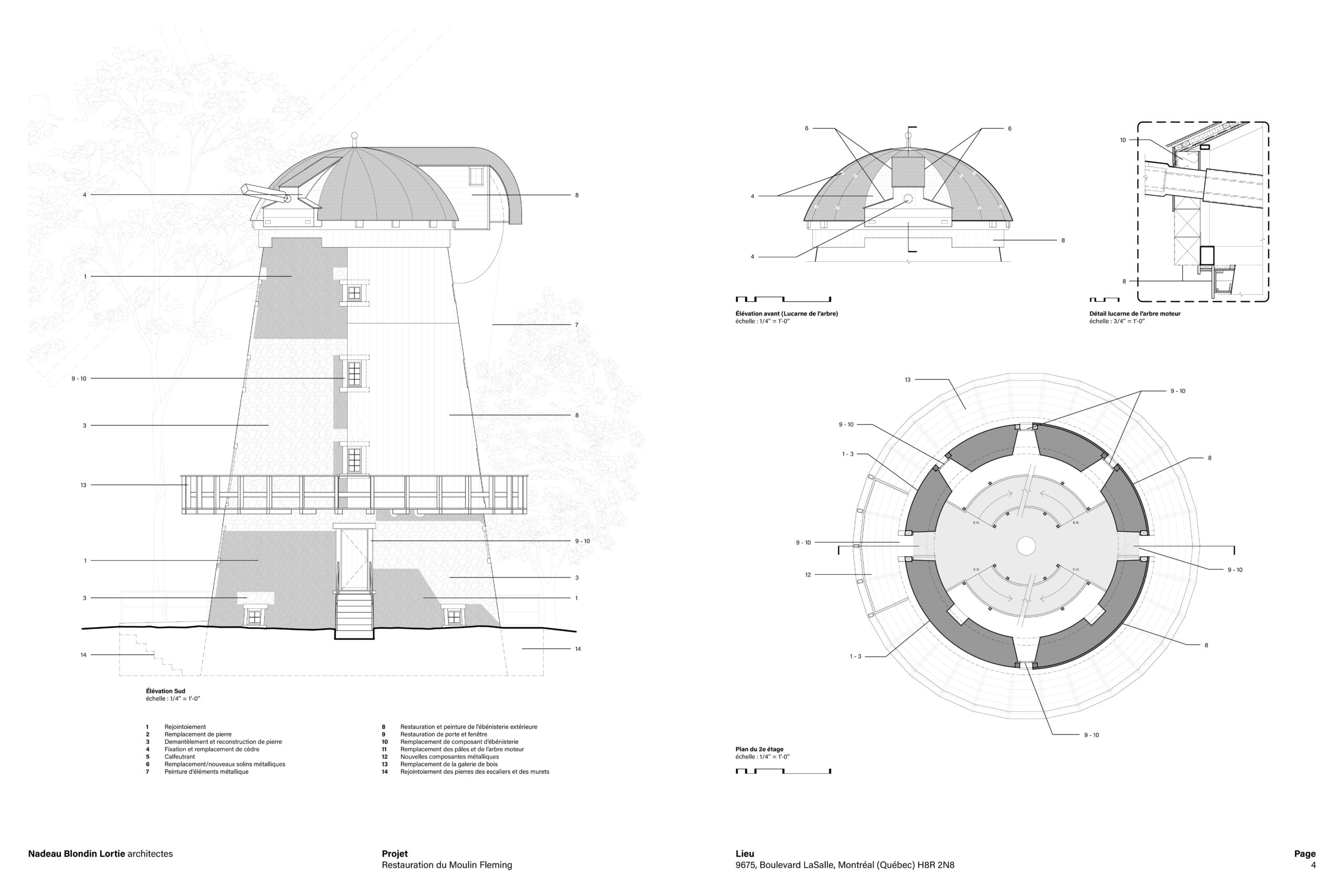La restauration du moulin à vent Fleming, situé à LaSalle sur l’île de Montréal, constitue un projet patrimonial d’une grande complexité, conjuguant conservation, défis techniques et engagement collectif. Érigé en 1827, le moulin est aujourd’hui le seul moulin-tour de type britannique subsistant au Québec et est classé bien patrimonial depuis 1983. Son état de dégradation avancé, aggravé par l’effondrement des ailes lors de vents violents en 2019, rendait nécessaire une intervention majeure touchant l’enveloppe, la structure et les composantes emblématiques du bâtiment.