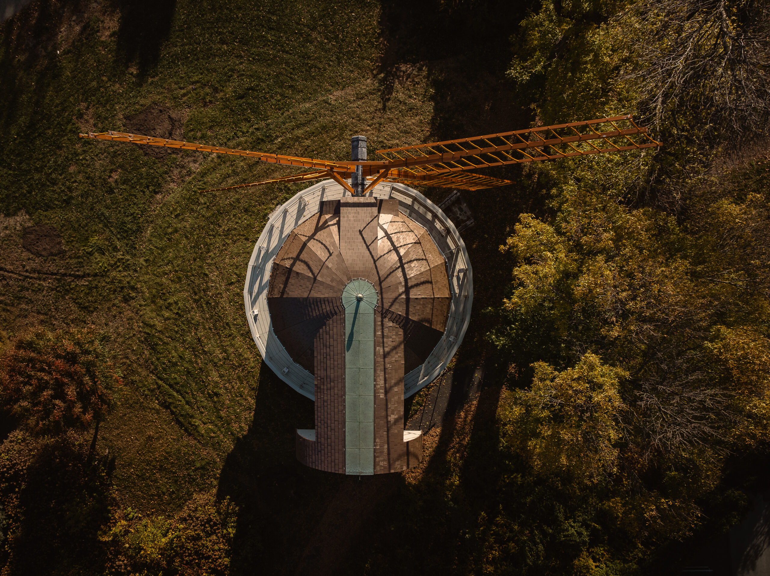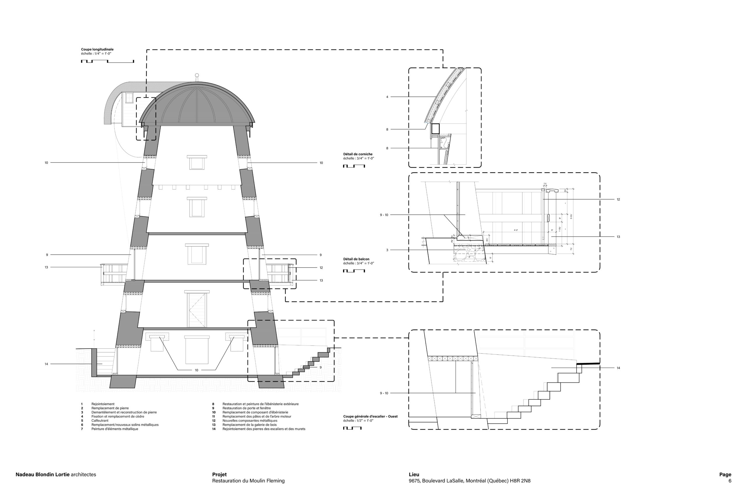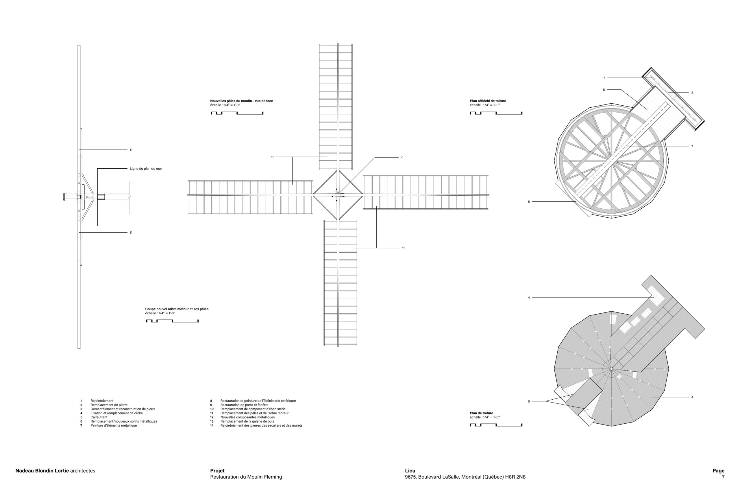Face à cette complexité, l’équipe de NBL architectes a adopté une approche fondée sur l’authenticité, la durabilité et la collaboration étroite avec des artisans spécialisés. Environ 60 % de la maçonnerie, soit près de 1000 pierres, a été démantelée et remplacée à l’aide de pierre calcaire provenant de l’Ontario et d’un mortier à base de chaux favorisant la respirabilité des murs. Le choix de reconstruire les pales entièrement en bois, à partir de sapin Douglas et de chêne blanc, témoigne d’un retour assumé à des solutions traditionnelles éprouvées et symboliquement fortes où les essences ont été sélectionnées pour leurs avantages intrinsèques.