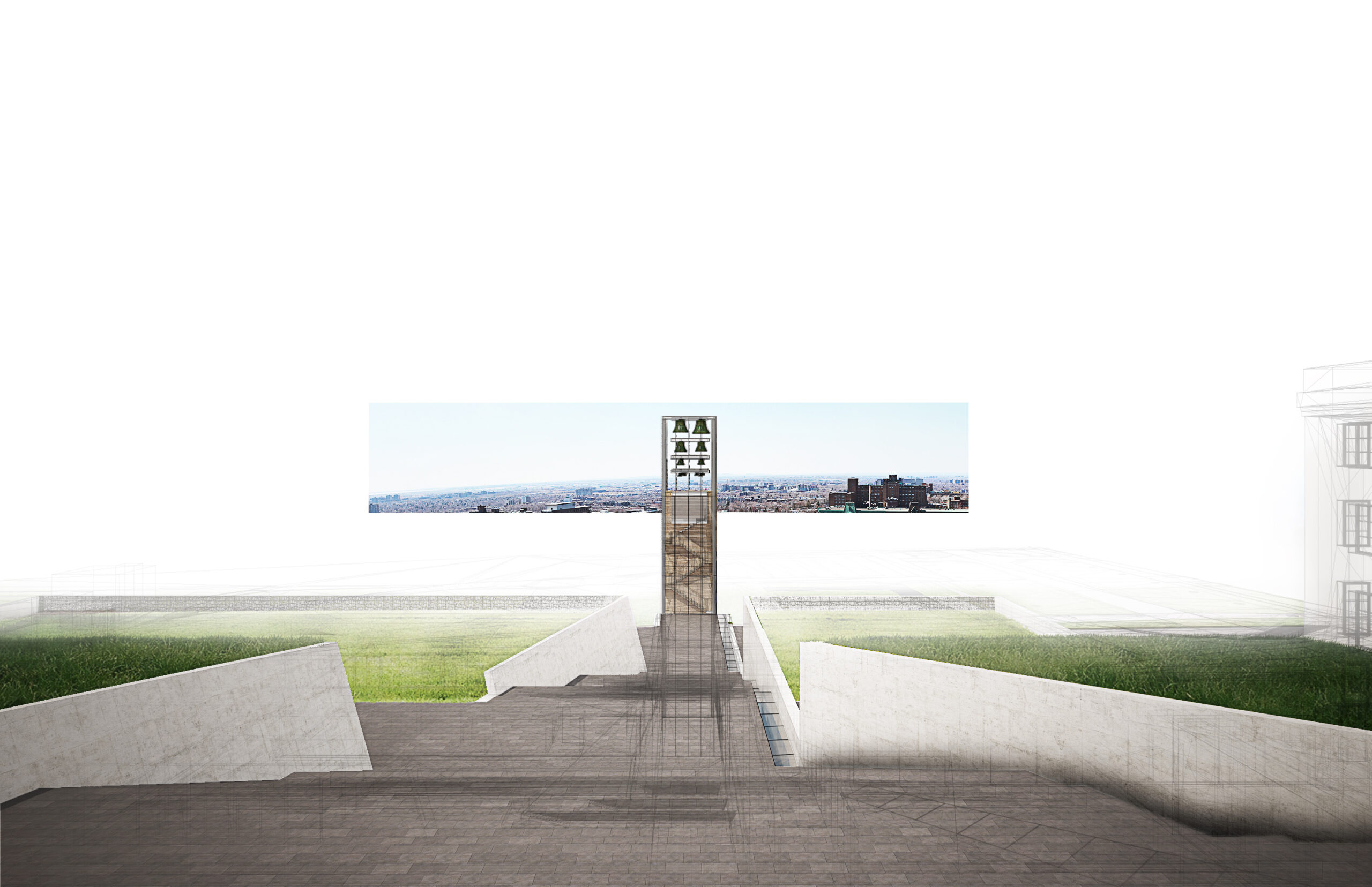 Le campanile, prisme translucide dont l’enveloppe de verre fritté suggère une notation musicale, devient à la fois phare et instrument. Autour de lui, une esplanade publique et un jardin sacré se déploient en terrasses végétalisées, créant des lieux de rassemblement et de recueillement entièrement accessibles.