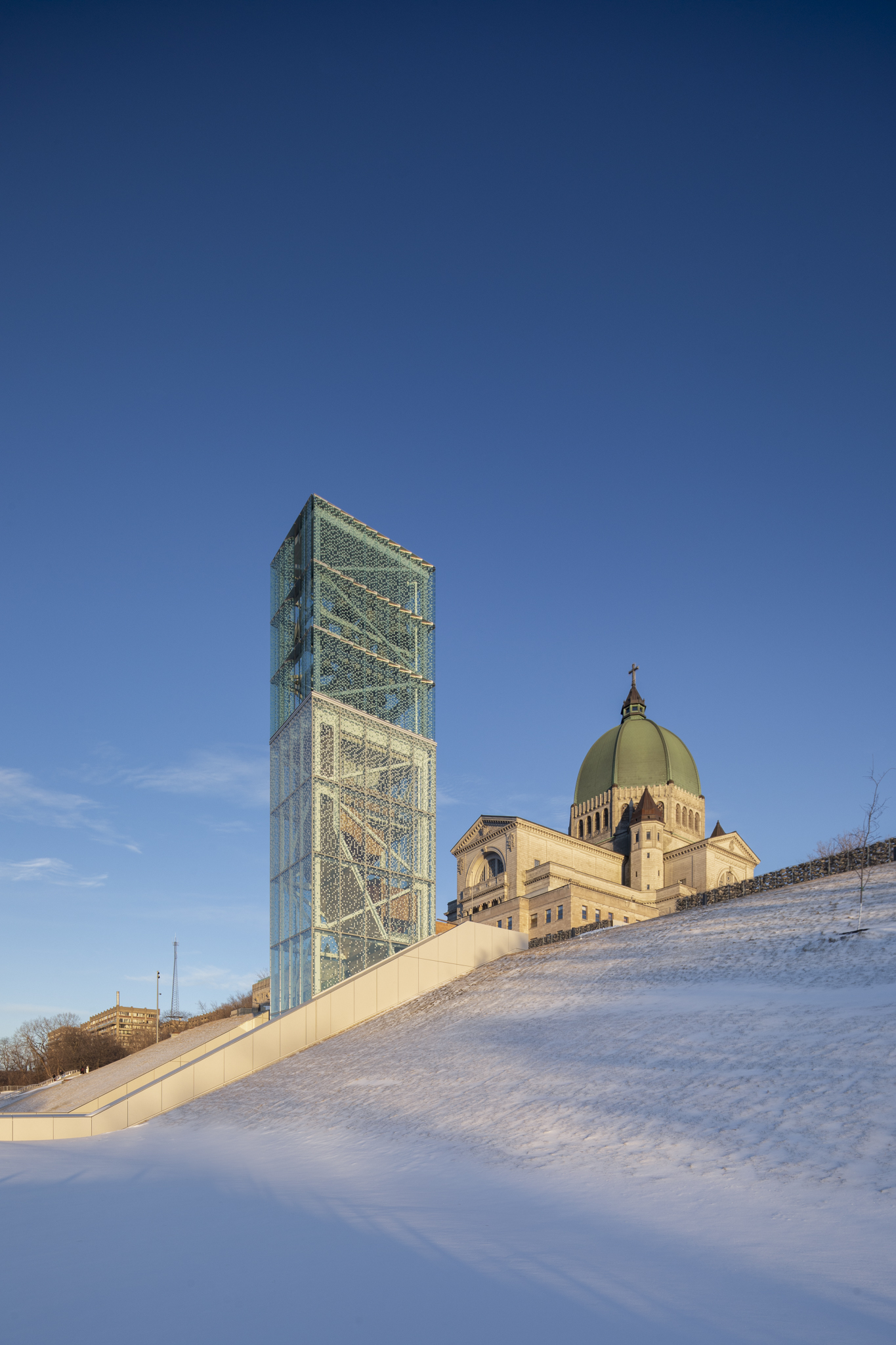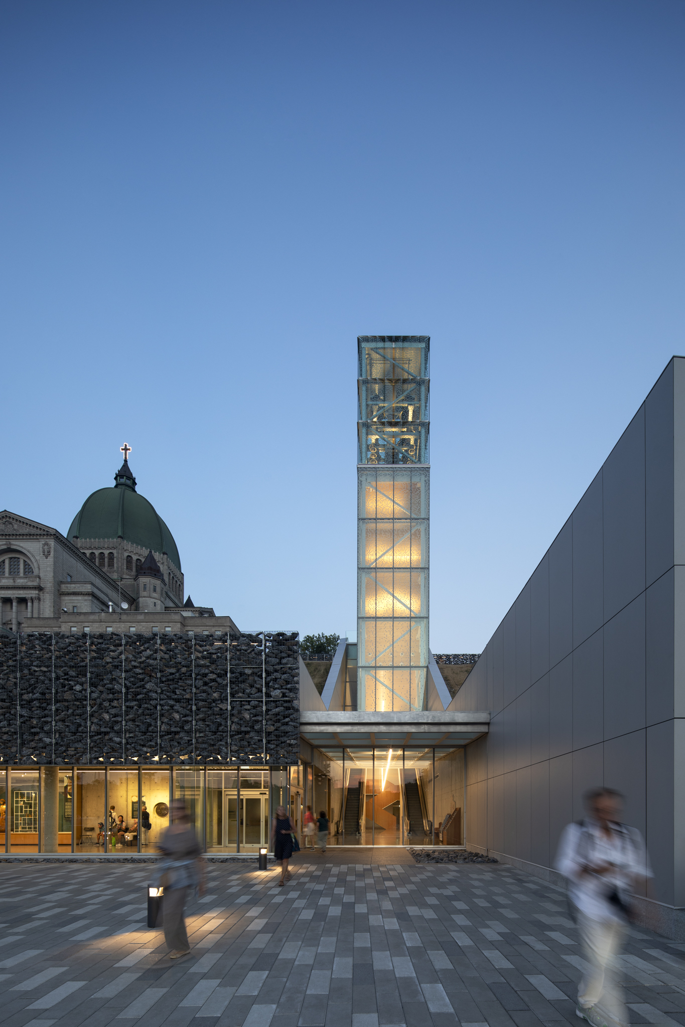 Perché sur le flanc du mont Royal, l’Oratoire Saint-Joseph définit depuis près d’un siècle la ligne d’horizon montréalaise. Ce projet le dote aujourd’hui d’une expérience de découverte renouvelée : un tout nouveau pavillon d’accueil de 5 770 m² encastré dans la topographie, ainsi qu’un campanile accueillant un carillon restauré.