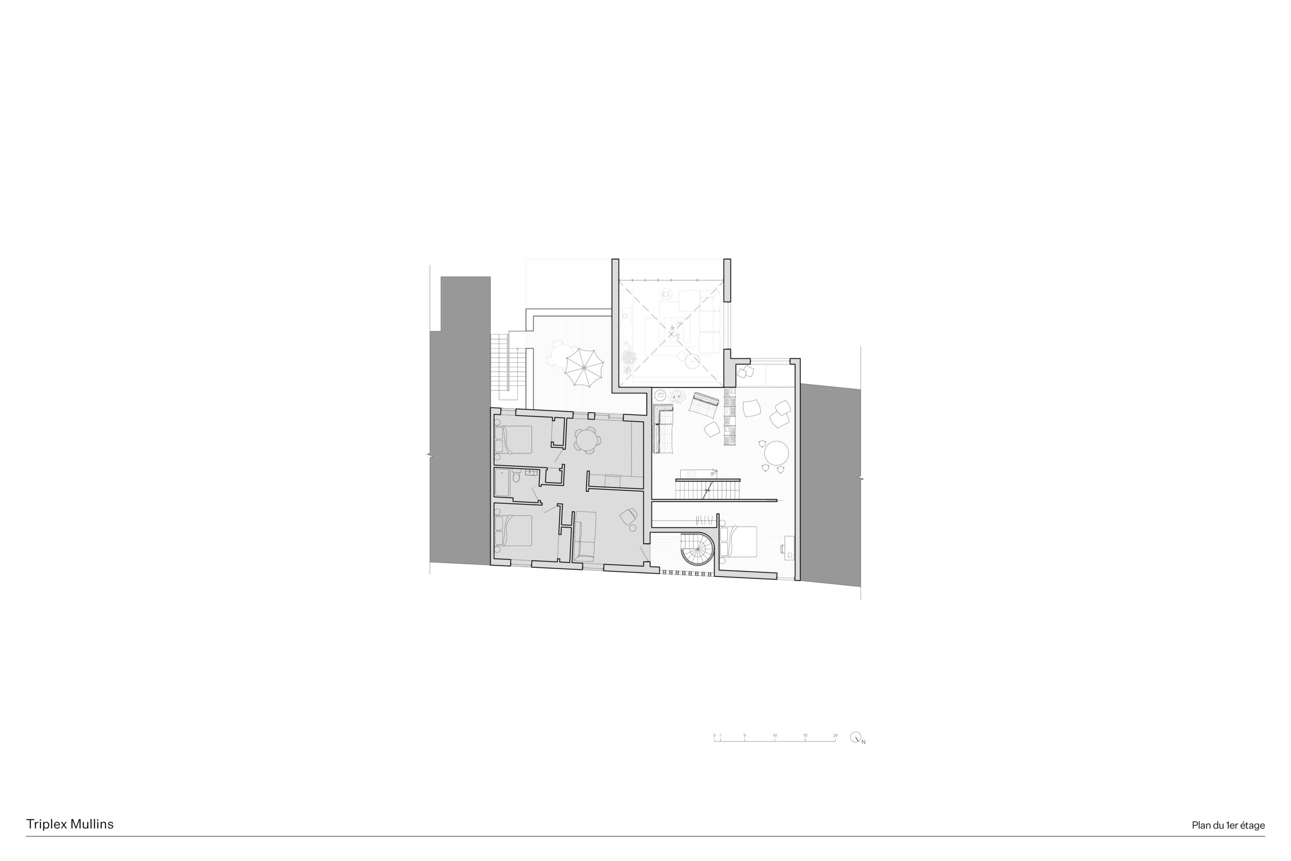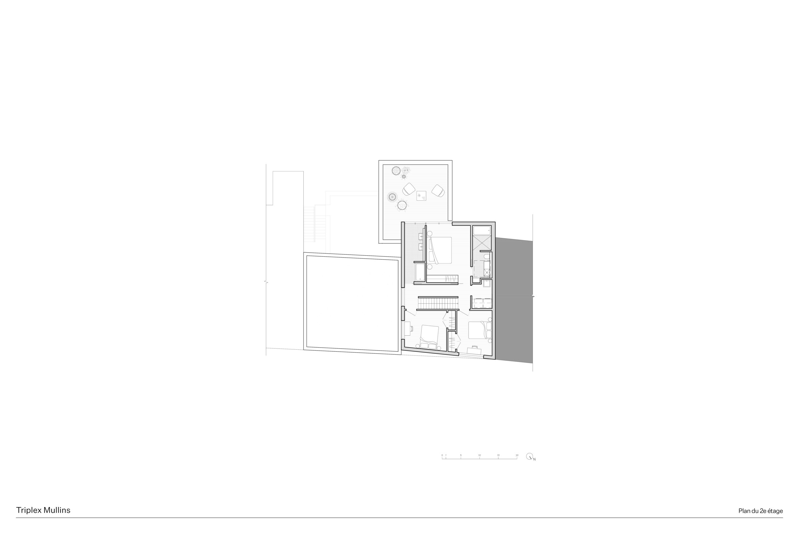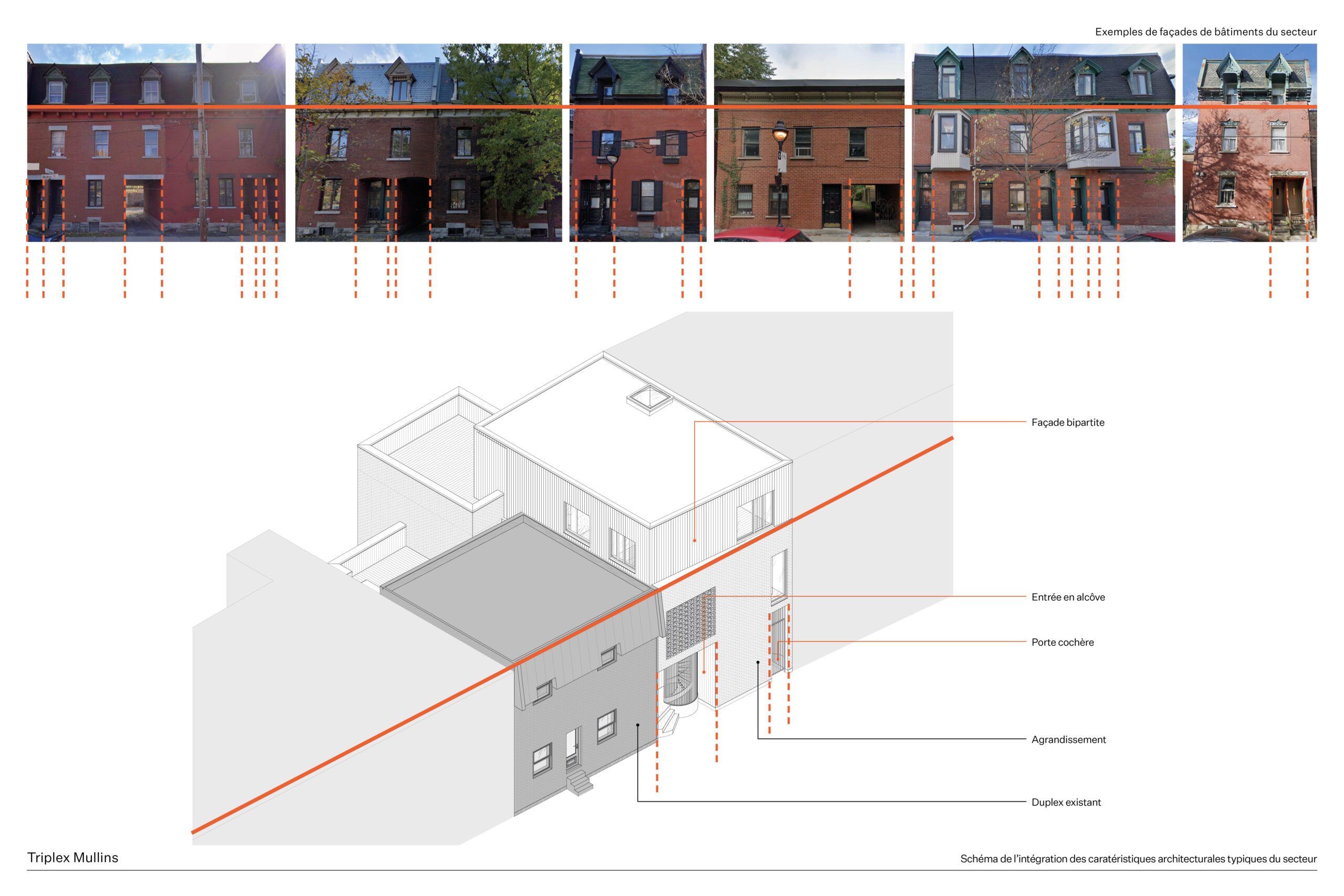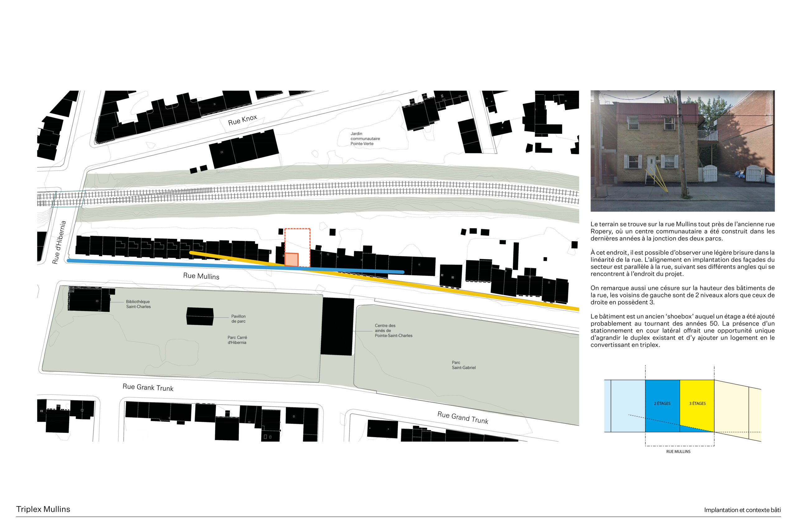 Situé à Pointe-Saint-Charles, quartier montréalais marqué par son passé industriel et ouvrier, le projet du Triplex Mullins propose une transformation mesurée du tissu résidentiel existant. L’intervention consiste à agrandir un duplex afin d’y intégrer un troisième logement, sur un terrain contraint par la proximité des bâtiments, la présence d’une voie ferrée et un rapport direct à la rue. L’objectif est d’augmenter la densité tout en offrant des espaces lumineux, généreux et intimistes, favorisant une cohabitation harmonieuse entre occupants aux modes de vie distincts.