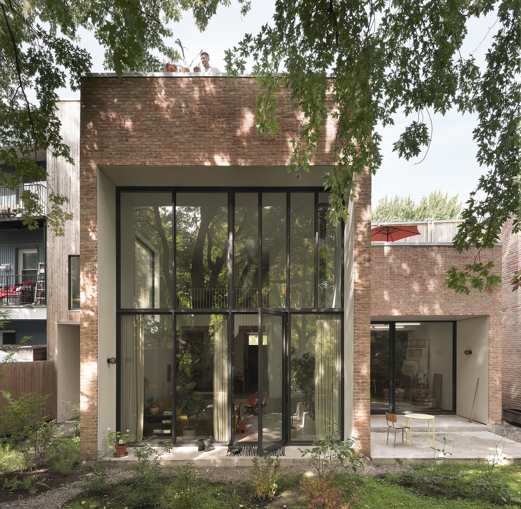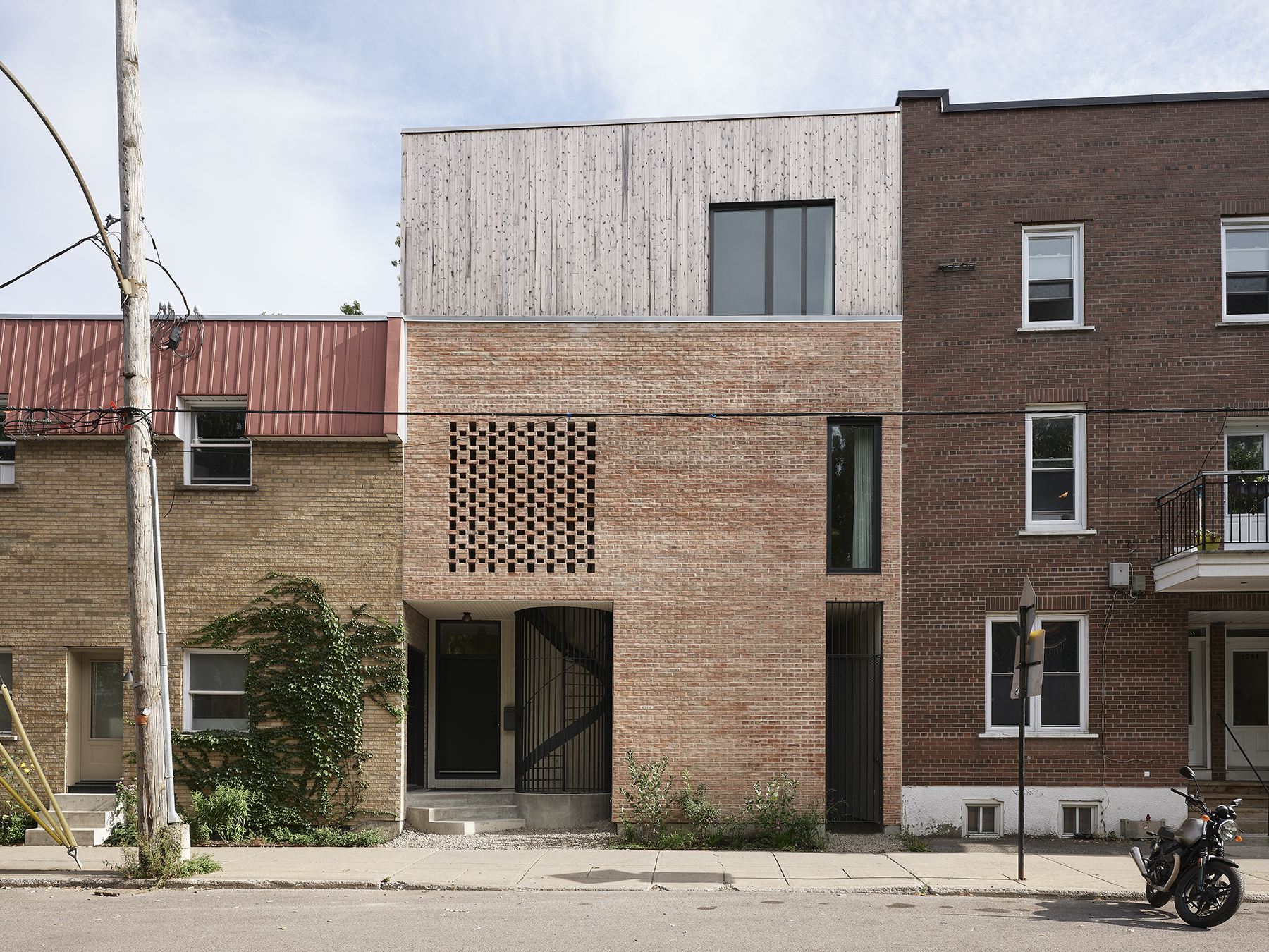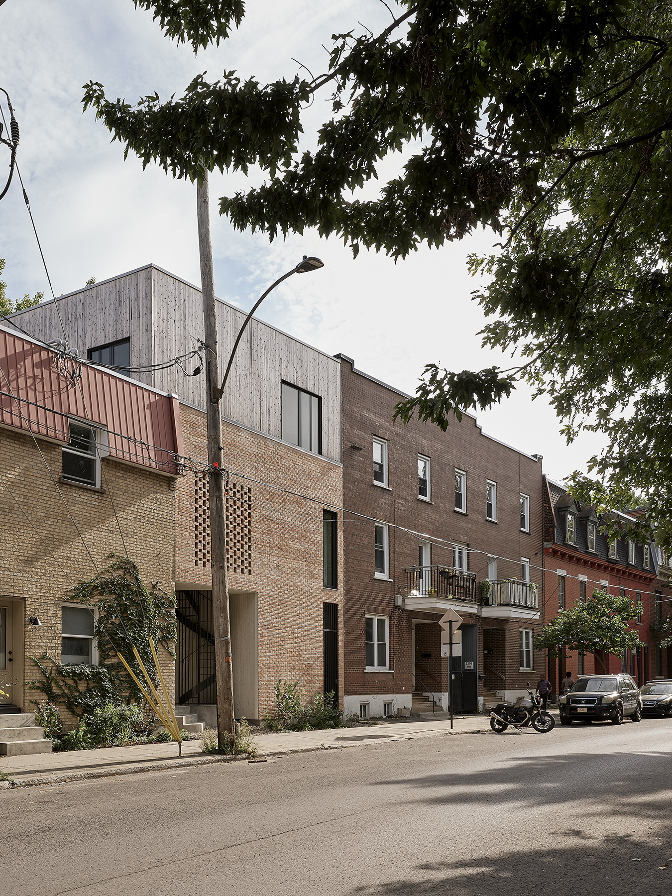 L’ajout d’un troisième logement à un duplex existant a donné lieu à une subtile réinterprétation de la matérialité du quartier. Un bel exemple de densification douce.