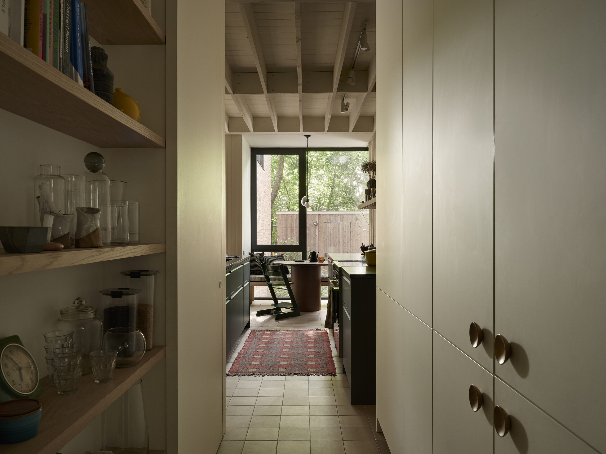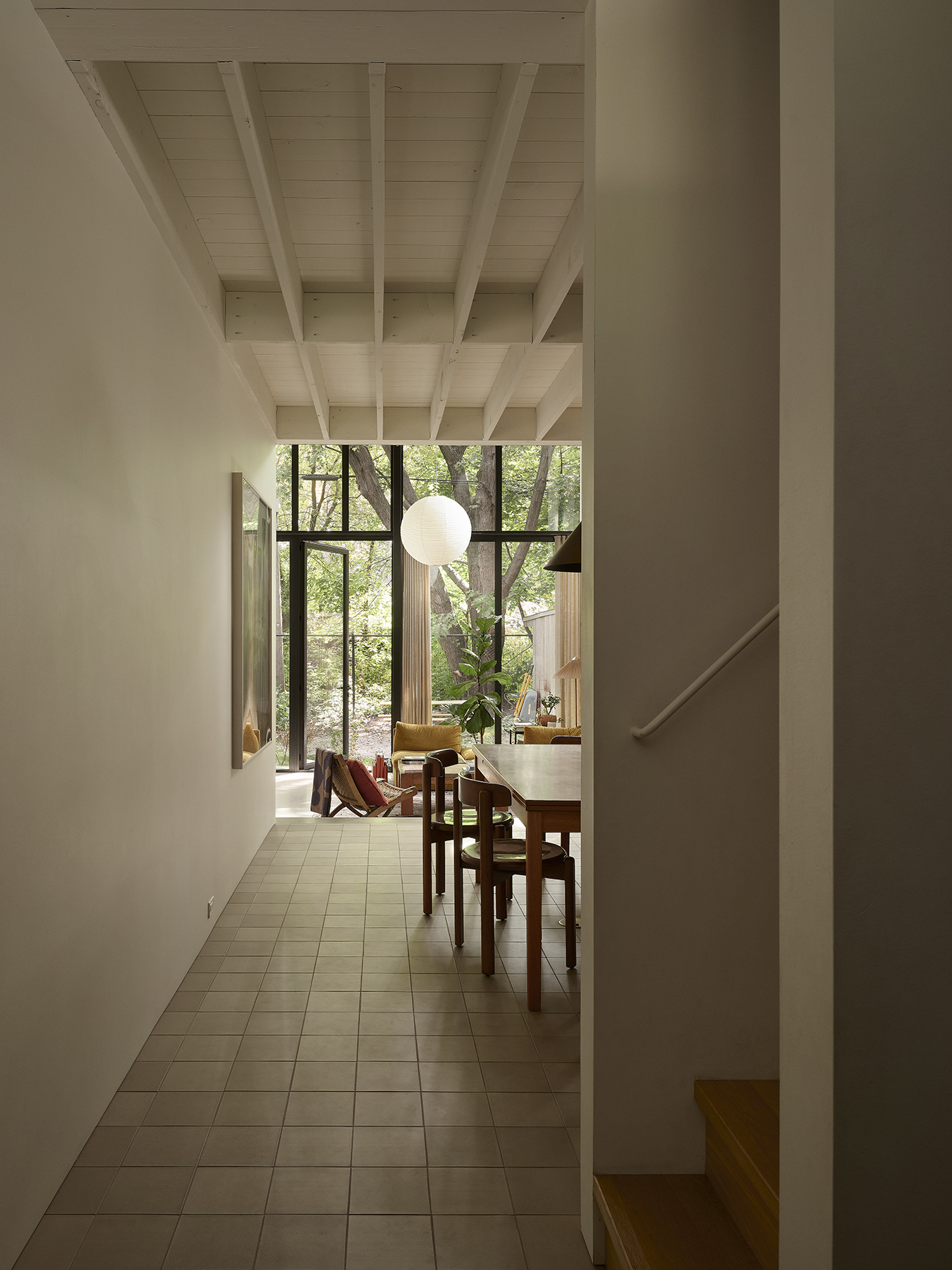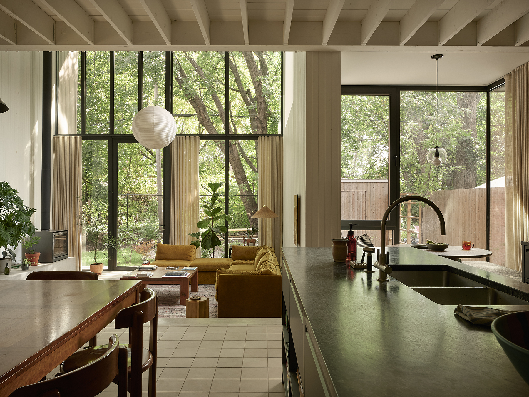 À l’intérieur, l’organisation spatiale privilégie la fluidité et la polyvalence. Les espaces de vie s’enchaînent progressivement, de la cuisine à la salle à manger conçue comme grande table de travail, jusqu’au séjour en double hauteur ouvert sur la cour. Les étages supérieurs accueillent des zones de détente, de jeu et de repos, dont une suite parentale donnant sur une terrasse nichée dans la canopée d’un érable conservé. La matérialité, riche et durable, soutient une expérience sensorielle chaleureuse, tandis que la lumière naturelle, les vues sur la végétation et le traitement acoustique contribuent au confort quotidien. Le projet illustre ainsi une densification sensible, attentive au contexte, aux usages et à la qualité de l’habitat urbain.