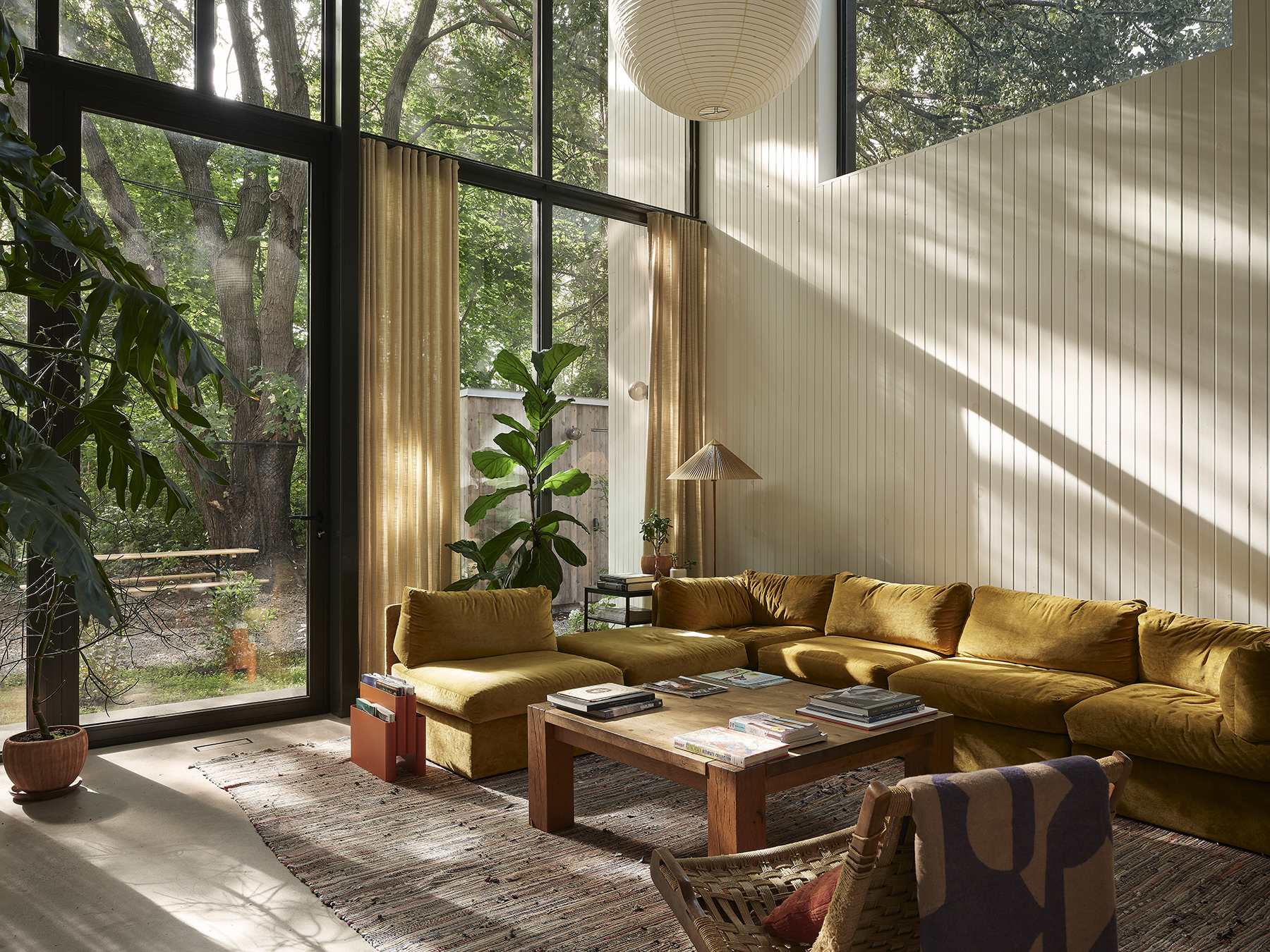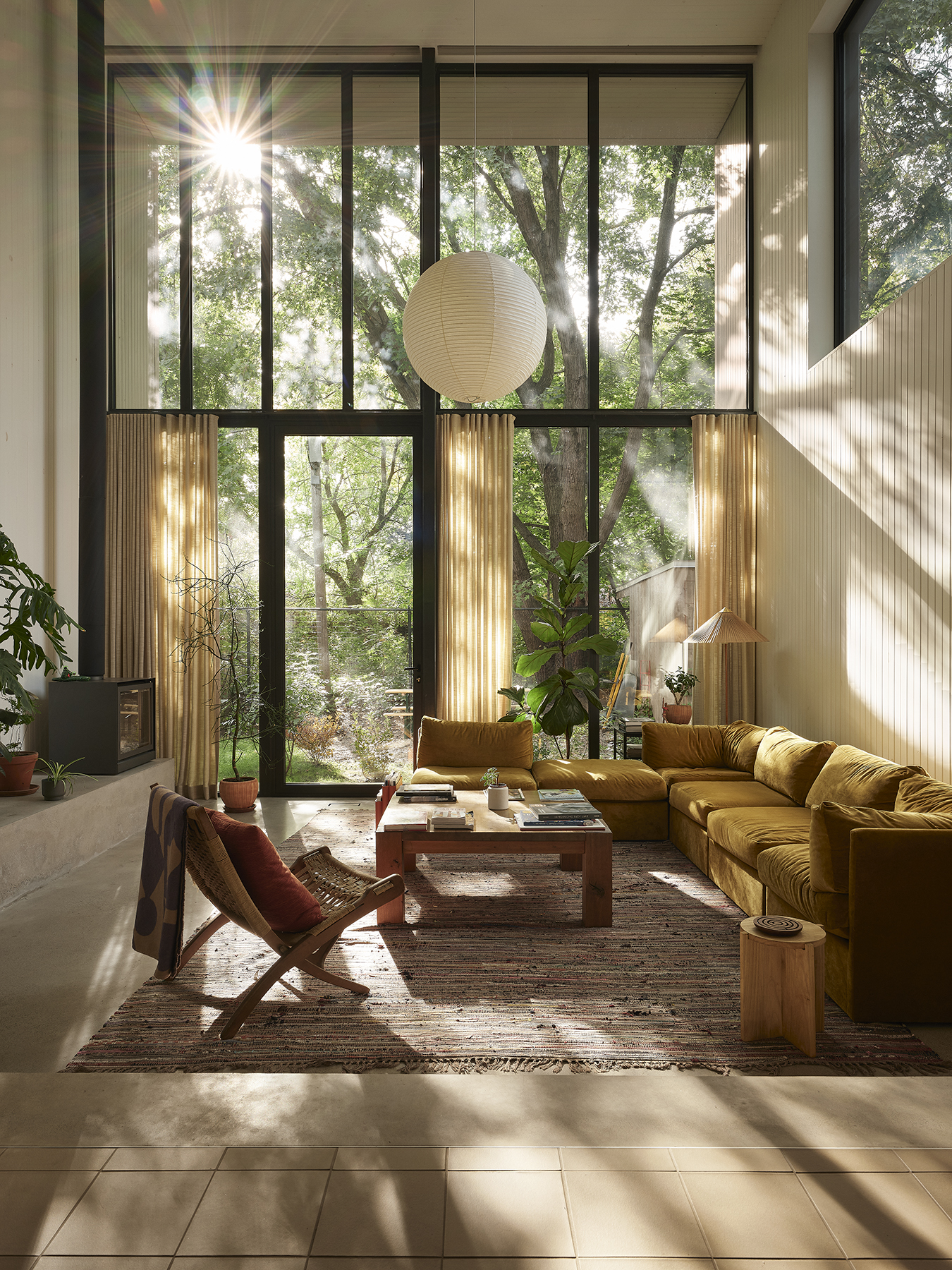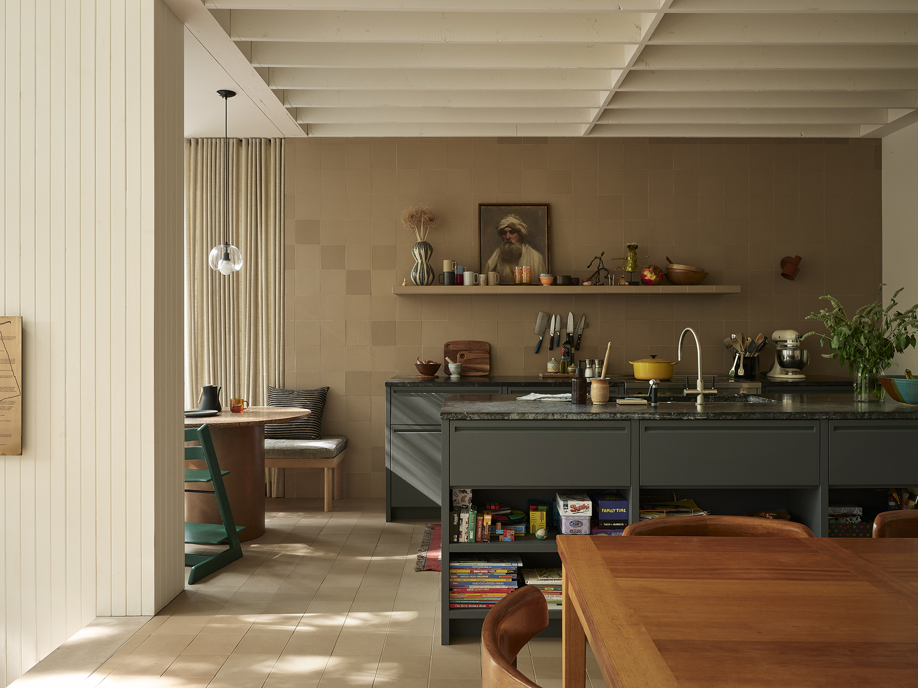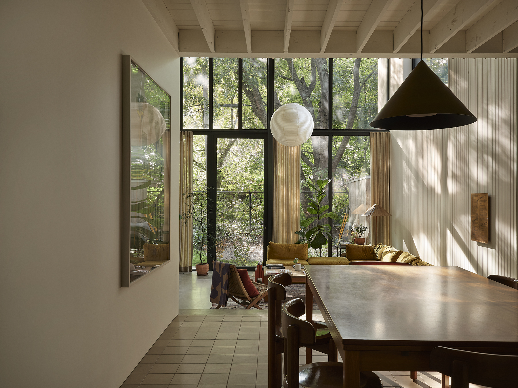 À l’intérieur, l’organisation spatiale privilégie la fluidité et la polyvalence. Les espaces de vie s’enchaînent progressivement, de la cuisine à la salle à manger conçue comme grande table de travail, jusqu’au séjour en double hauteur ouvert sur la cour. Les étages supérieurs accueillent des zones de détente, de jeu et de repos, dont une suite parentale donnant sur une terrasse nichée dans la canopée d’un érable conservé. La matérialité, riche et durable, soutient une expérience sensorielle chaleureuse, tandis que la lumière naturelle, les vues sur la végétation et le traitement acoustique contribuent au confort quotidien. Le projet illustre ainsi une densification sensible, attentive au contexte, aux usages et à la qualité de l’habitat urbain.