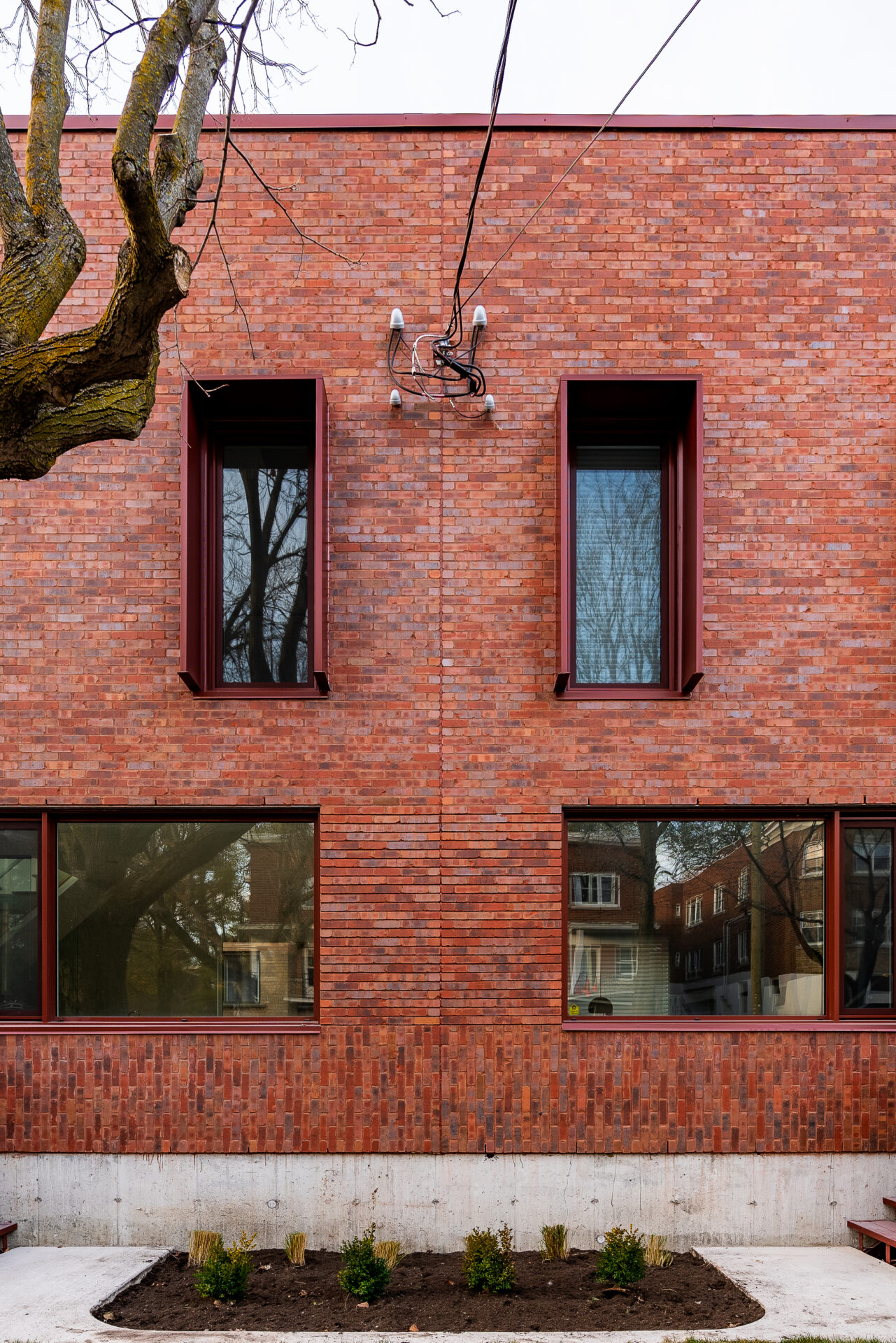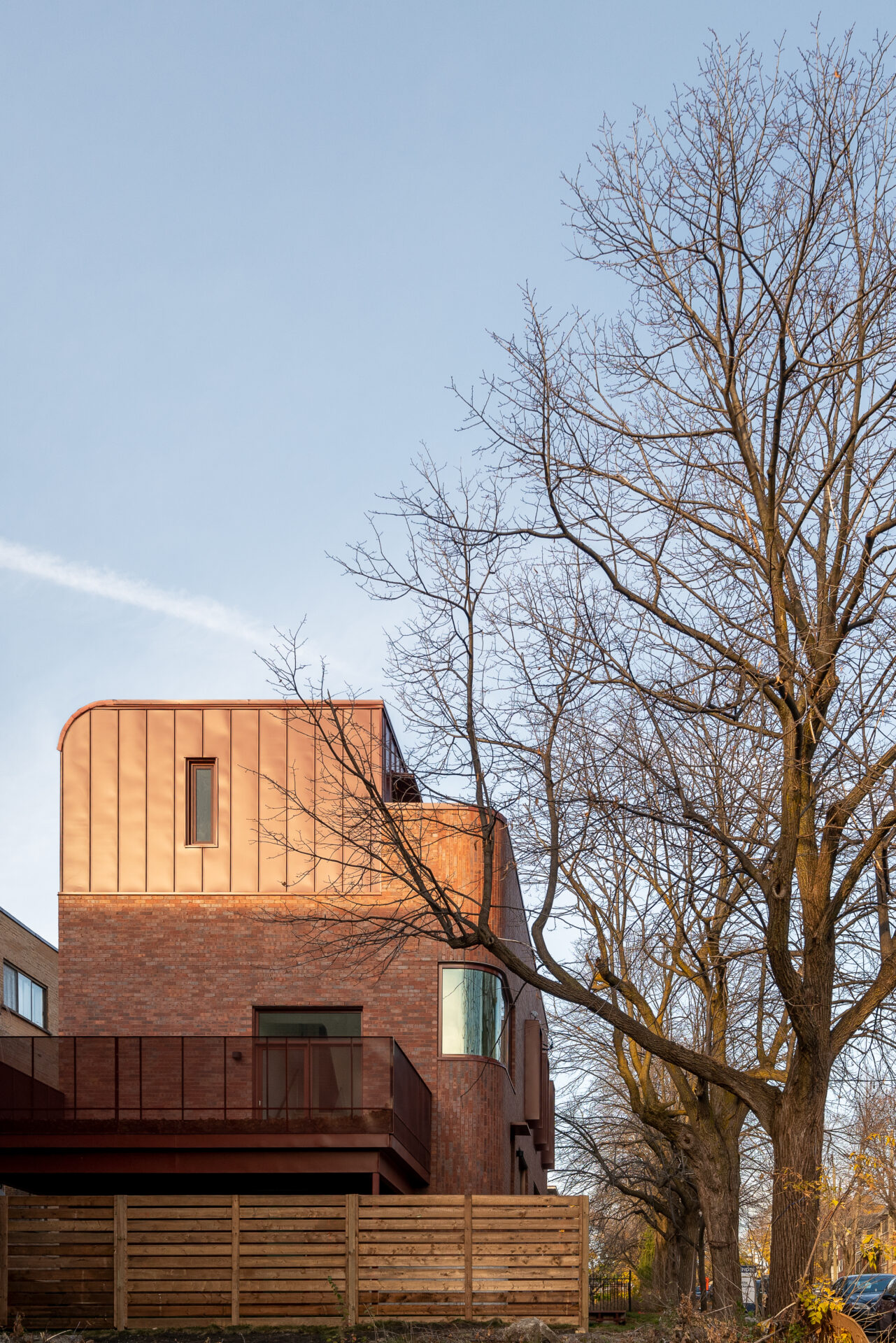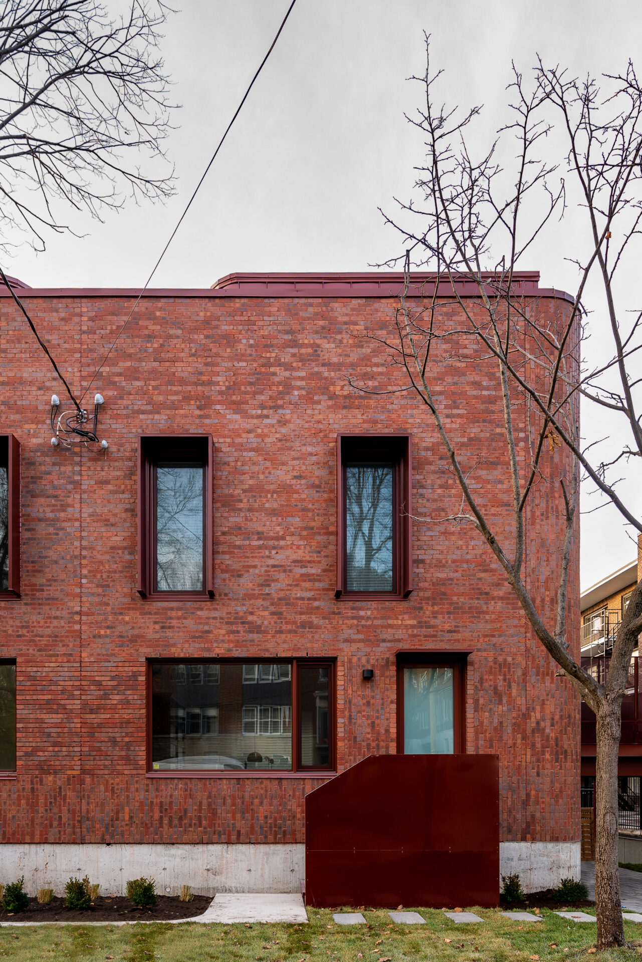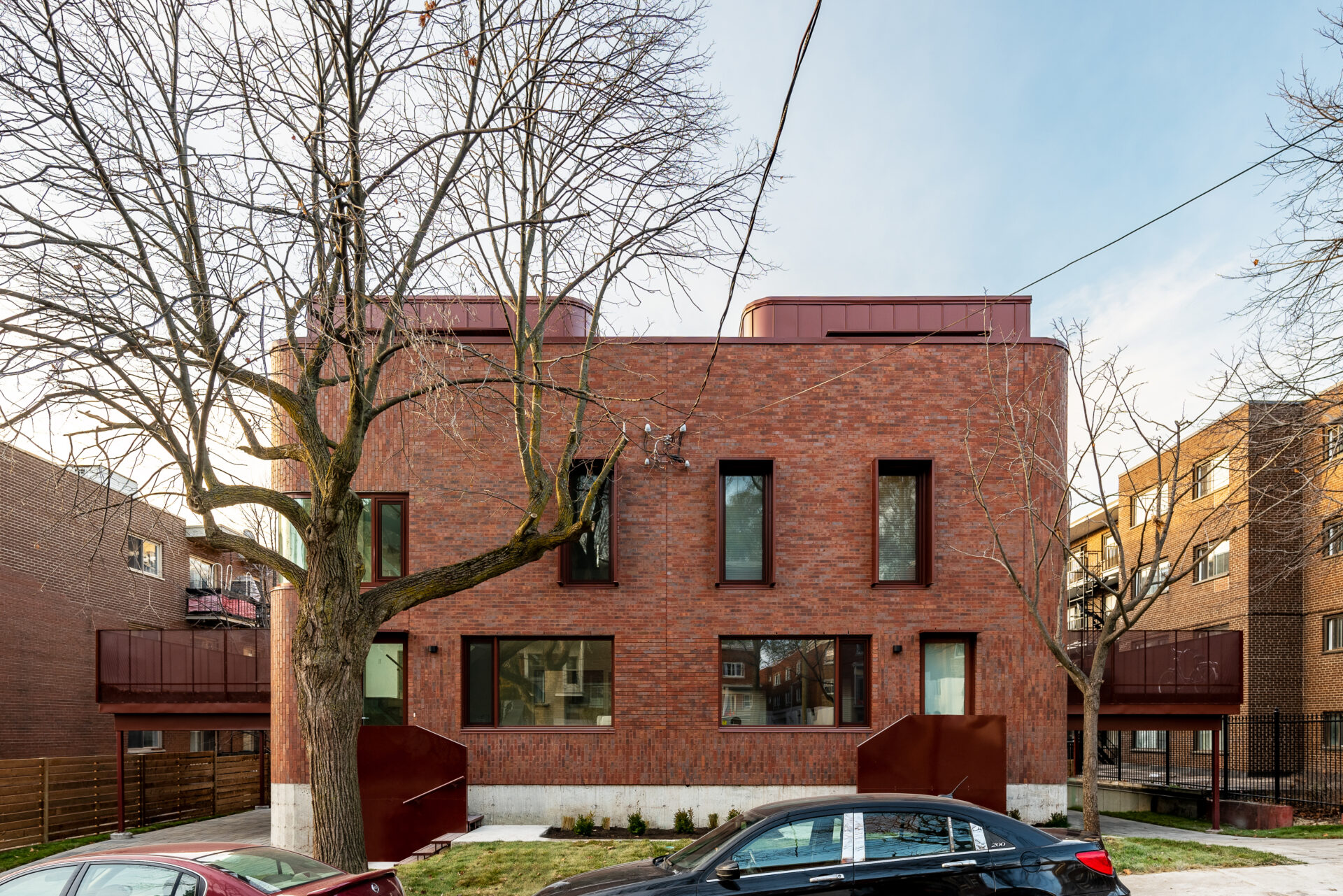 Implanté sur un terrain exigu dans le quartier Côte-des-Neiges, à Montréal, ce jumelé constitue un magnifique exemple de densification douce. Toutes ses façades présentent un haut niveau de maîtrise esthétique qui rehausse l’attrait du quartier et fait oublier la proximité des immeubles voisins. Qu’il s’agisse de sa fenêtre arrondie, des détails de la maçonnerie ou du savant équilibre entre ouvertures et zones d’intimité, les attributs de ce projet démontrent qu’il est possible de densifier la ville de façon respectueuse et expressive.