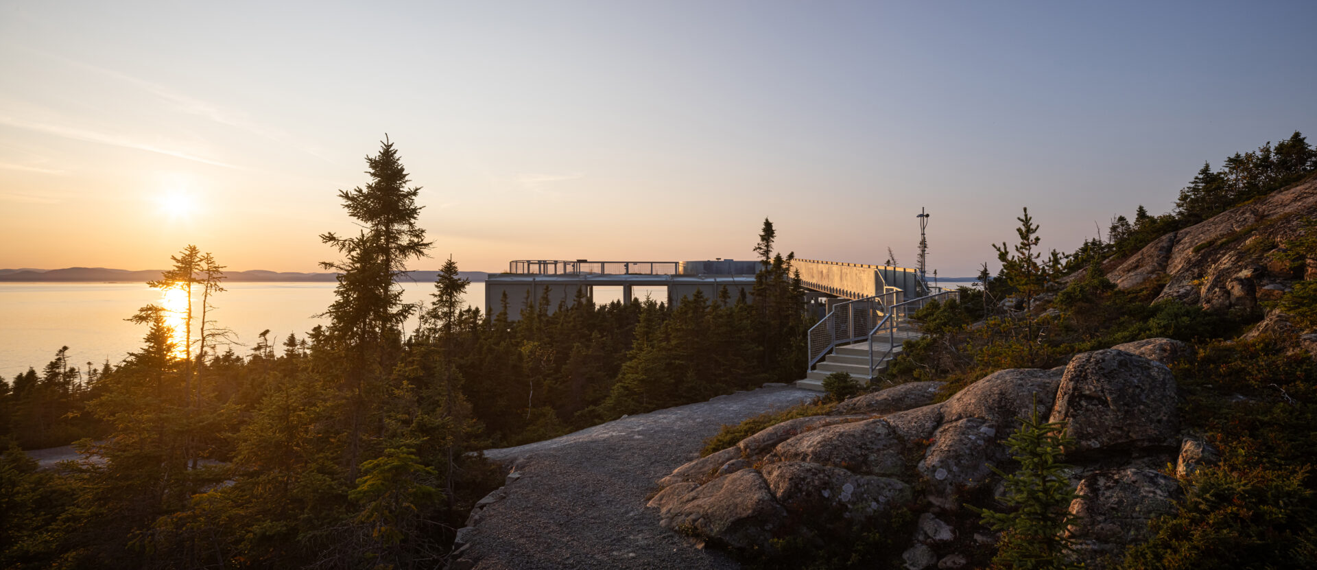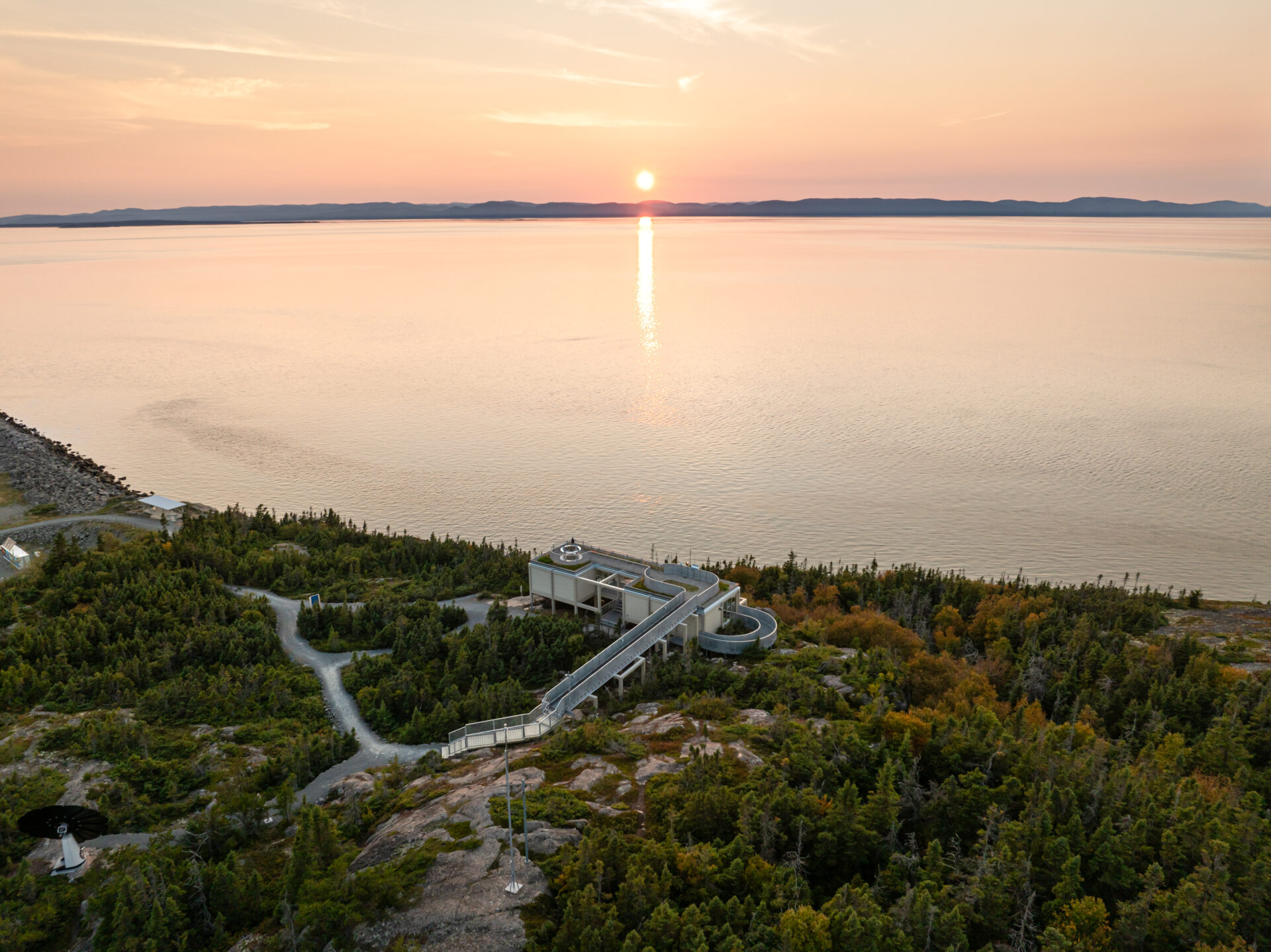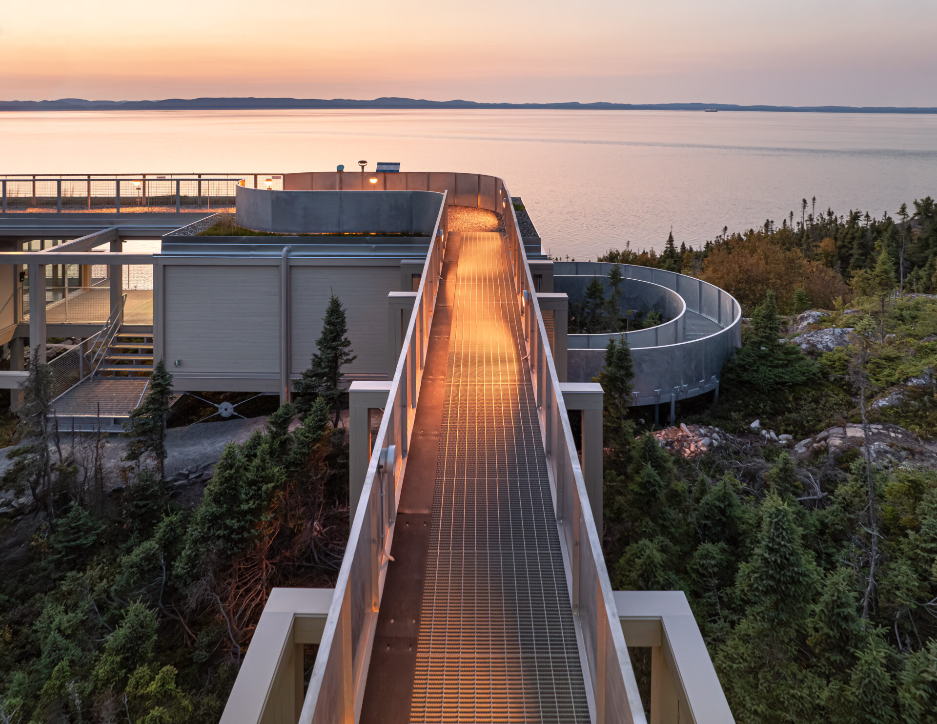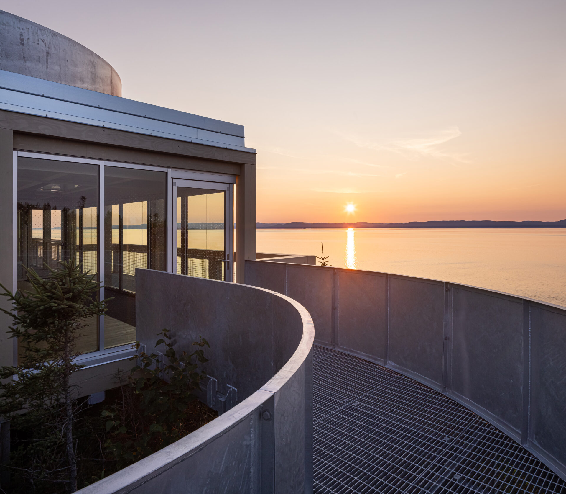 Située dans la portion ouest de la montagne de Gros-Cacouna, dans le Bas-Saint-Laurent, ce lieu d’observation est un modèle de sensibilité au contexte. Conçu selon la signature architecturale et paysagère de la Première Nation Wolastoqiyik Wahsipekuk, qui gère le site, il rappelle à chaque instant l’horizontalité et l’immensité du fleuve. Implanté sur pilotis, coiffé d’un toit végétalisé, le pavillon se fond dans la nature tout en proposant un parcours ludique invitant à la découverte. Le jury a été séduit par la simplicité et la fraîcheur de cet objet qui possède son langage propre, à mille lieues des dogmes de l’architecture contemporaine.